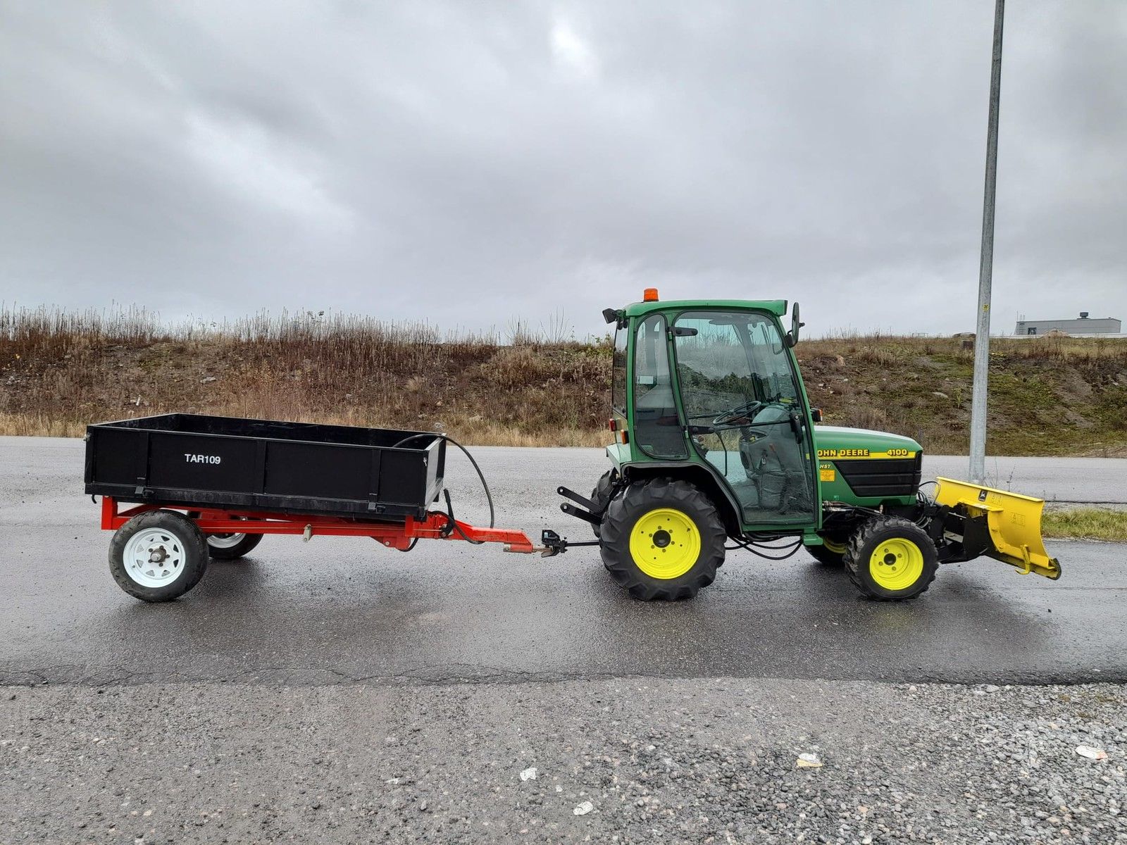 Lumi traktori: John Deere 4100 auralla ja peräkärry, Masku