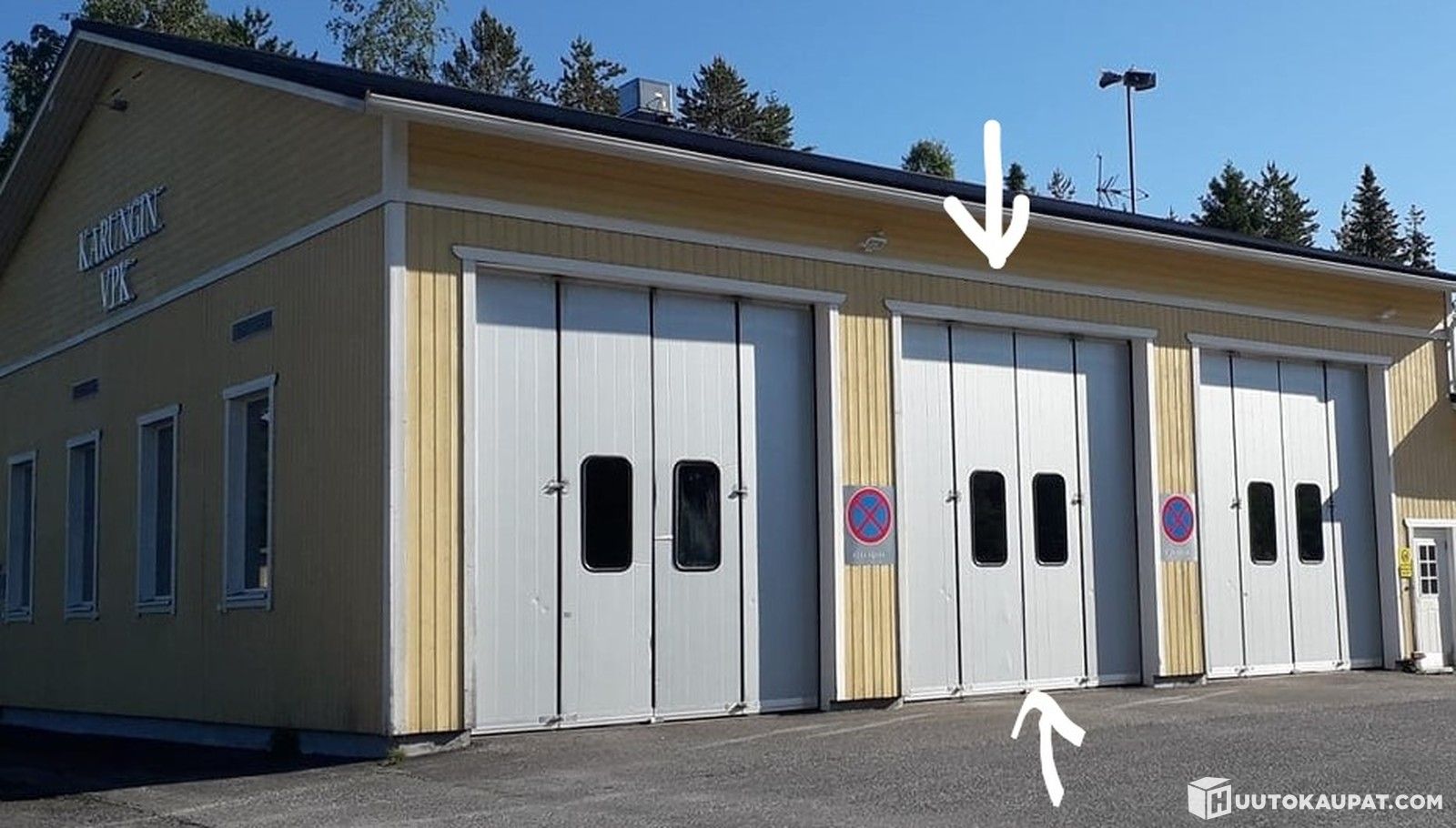 Hallin ovet leveys 4070 mm, korkeus 4500 mm, ovilehden paksuus n. 50 mm (ovipari nro 2, kuvassa merkitty nuolella), Tornio