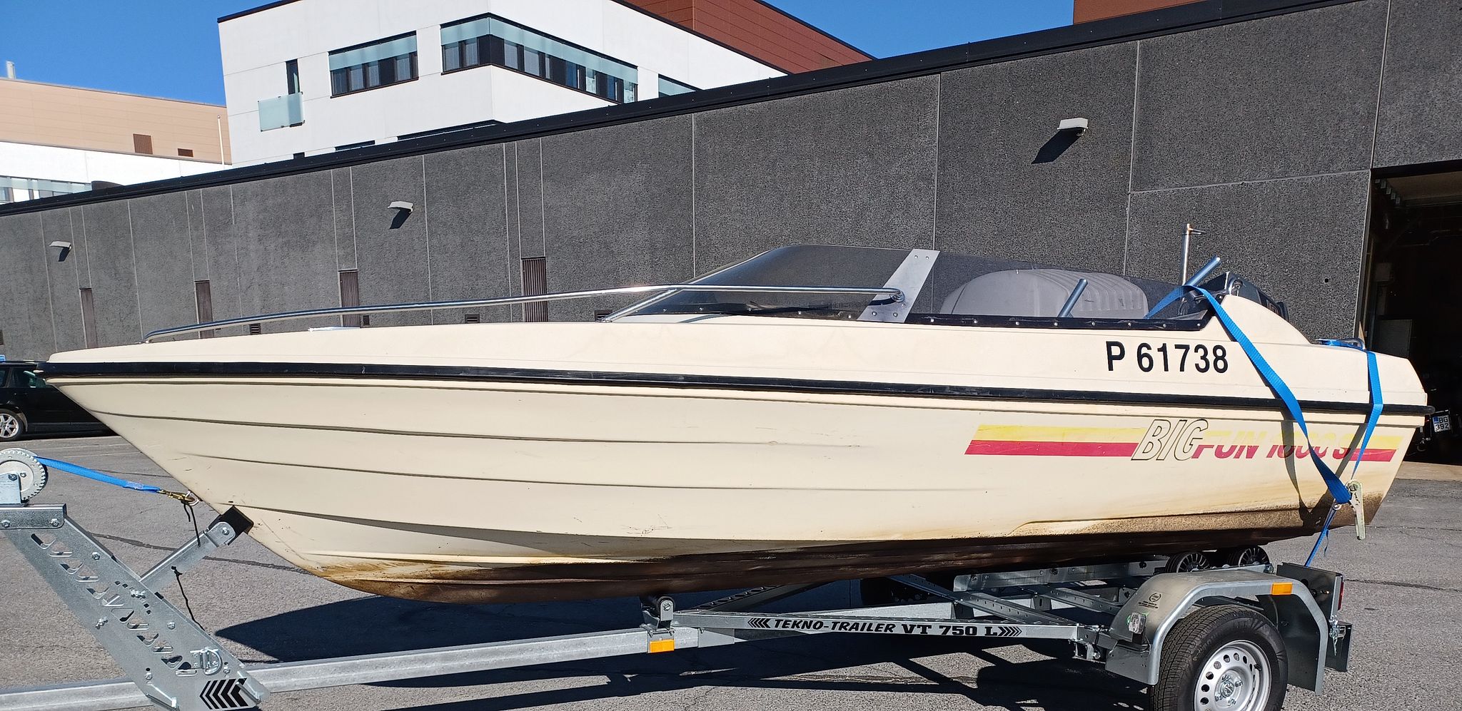 Myydään ulosmitattu osittain katettu moottorivene ja veneen kuljetustraileri / Säljes utmätta delvis täckt motorbåt och lätt båt transport trailer, Seinäjoki