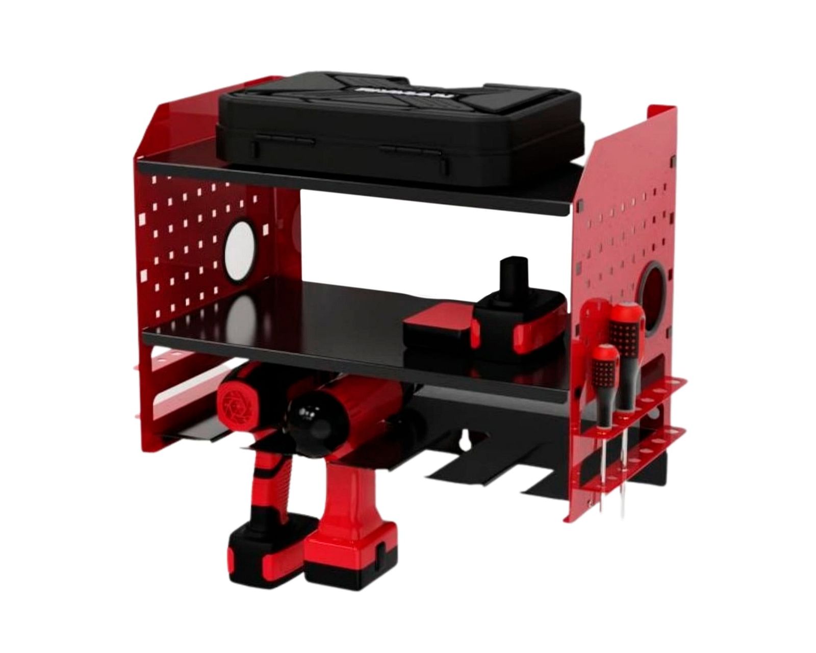 Tukeva, teräsrakenteinen säilytyshyllykkö akkukoneiden ja tarvikkeiden säilytykseen. Takuu 1 vuosi!, Orimattila