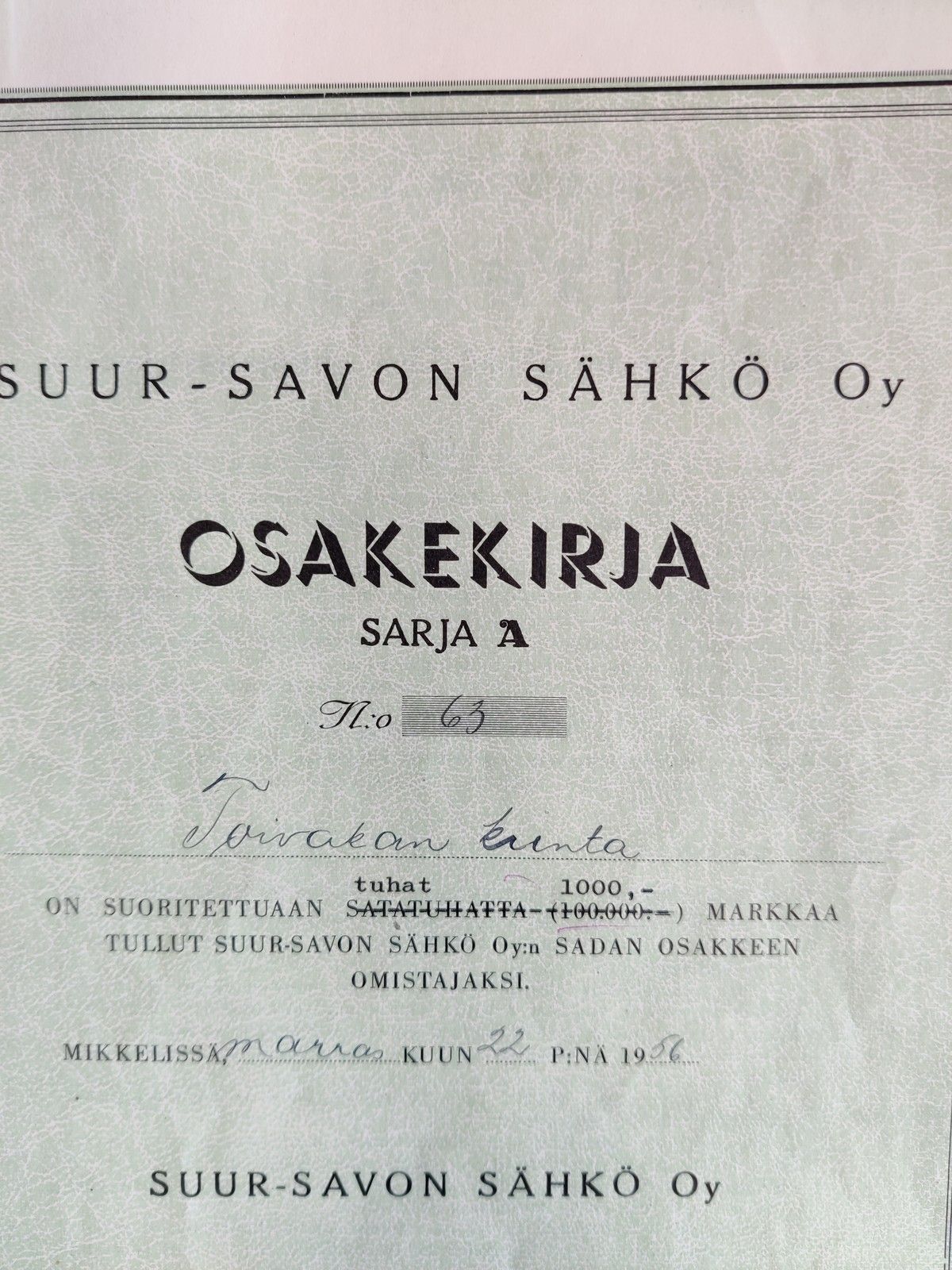 Suur-Savon Sähkö Oy:n osakkeita 3 kpl, Toivakka