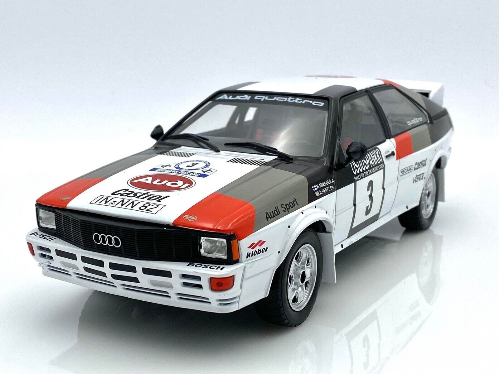 Audi Quattro, 1000 Lakes rally 1982 - H. Mikkola / A. Hertz, metallinen keräilyauto., Mikkeli
