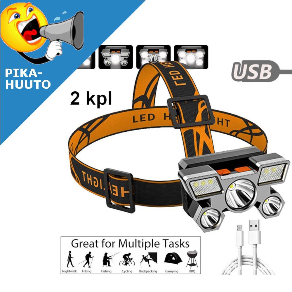 *PIKAHUUTO: 2 kpl Ladattavia Otsalamppuja 5Led USB 18650 Akuilla, Hämeenlinna
