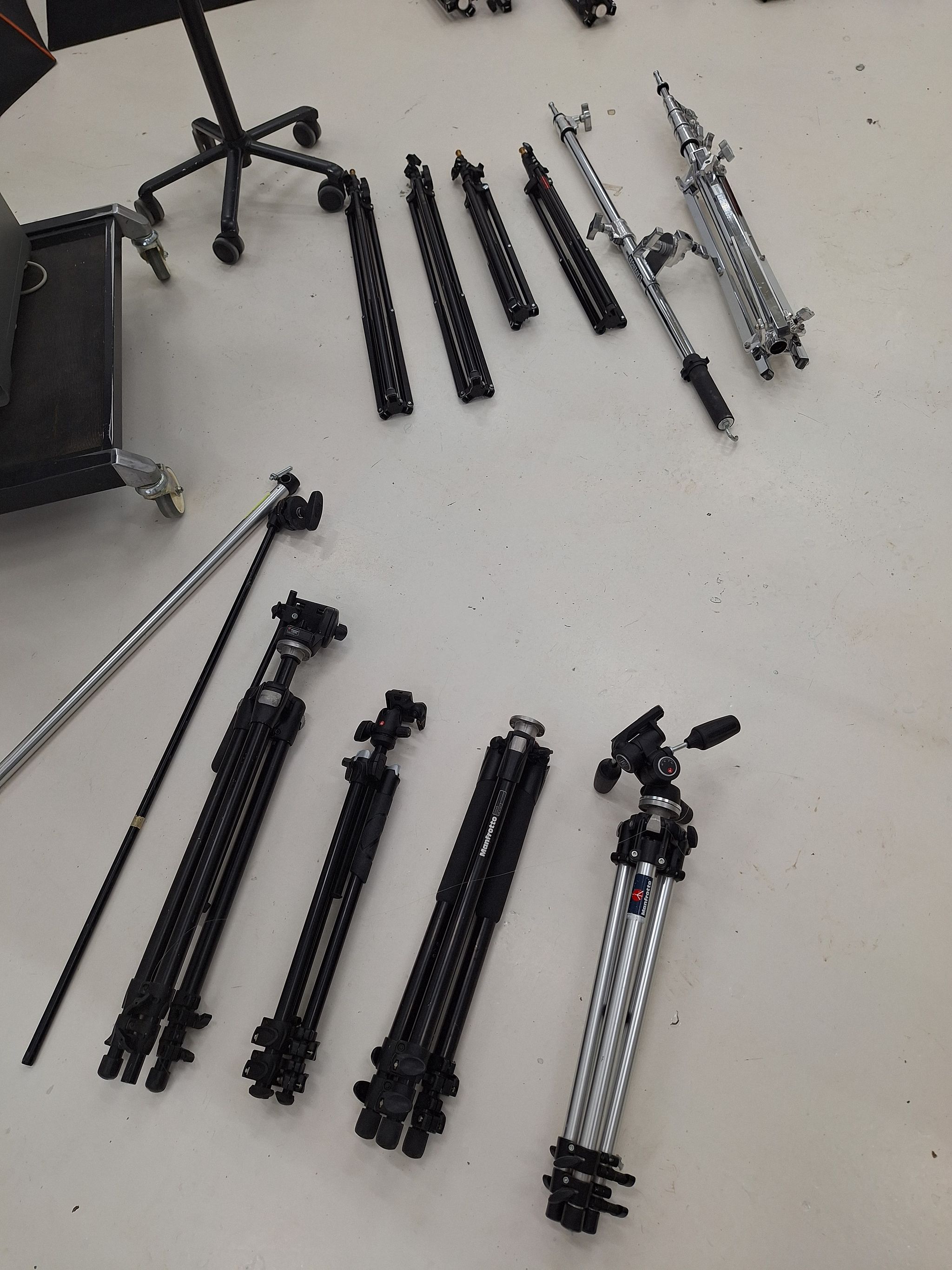 5kpl valojalusta, 4kpl kamerajalusta ja 1kpl puomi. Studio Schmid oy konkrussipesä, Helsinki