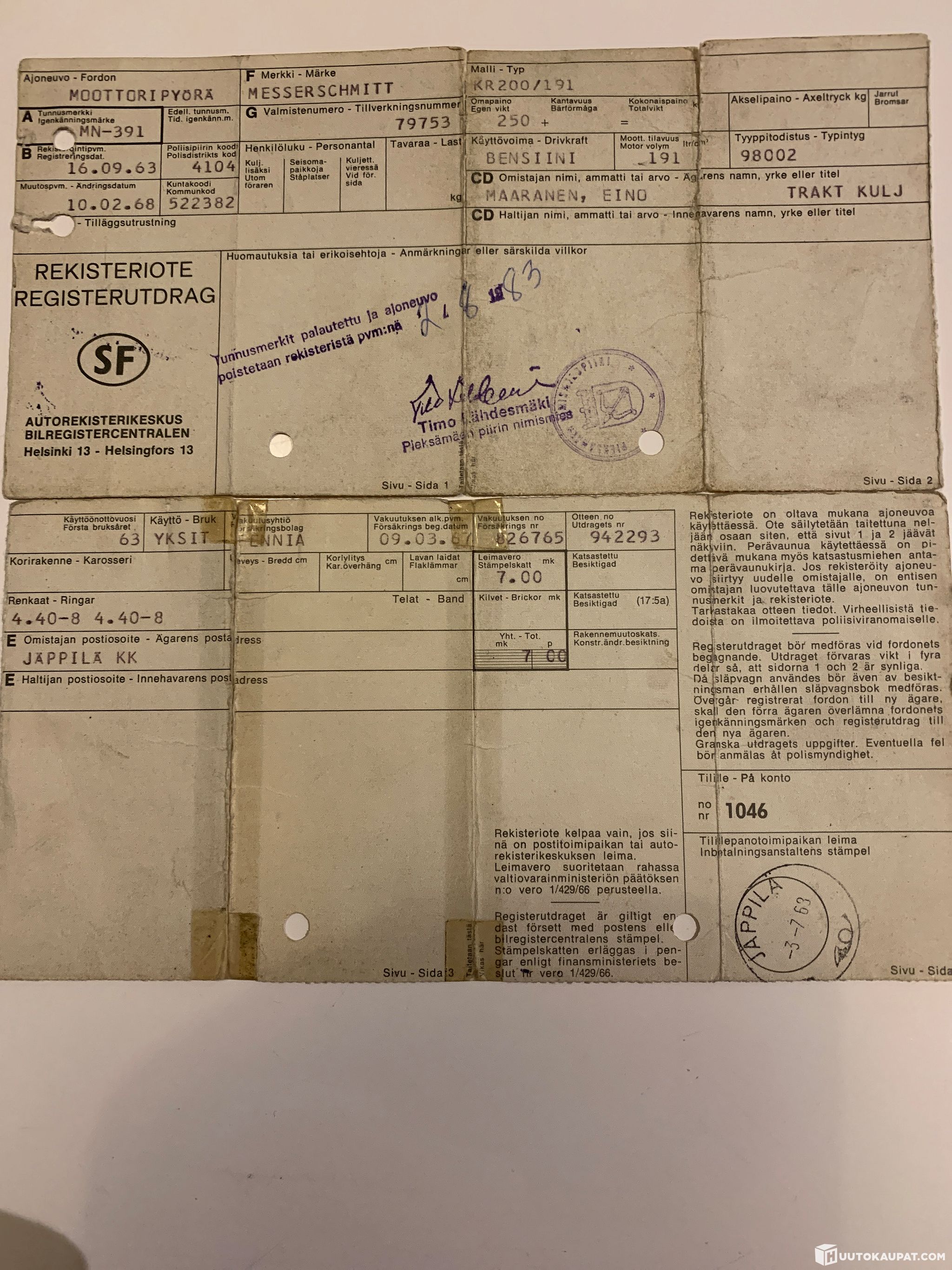 2011 valmistunut, alan ammattilaisen täysin entisöimä museorekisteröimä Messerschmitt. Koko tekniikka uusittu kulutusosien osalta. Kori korjattu ja ammattimaalari maalannut, verhoilut uusittu eli täys-entisöity.