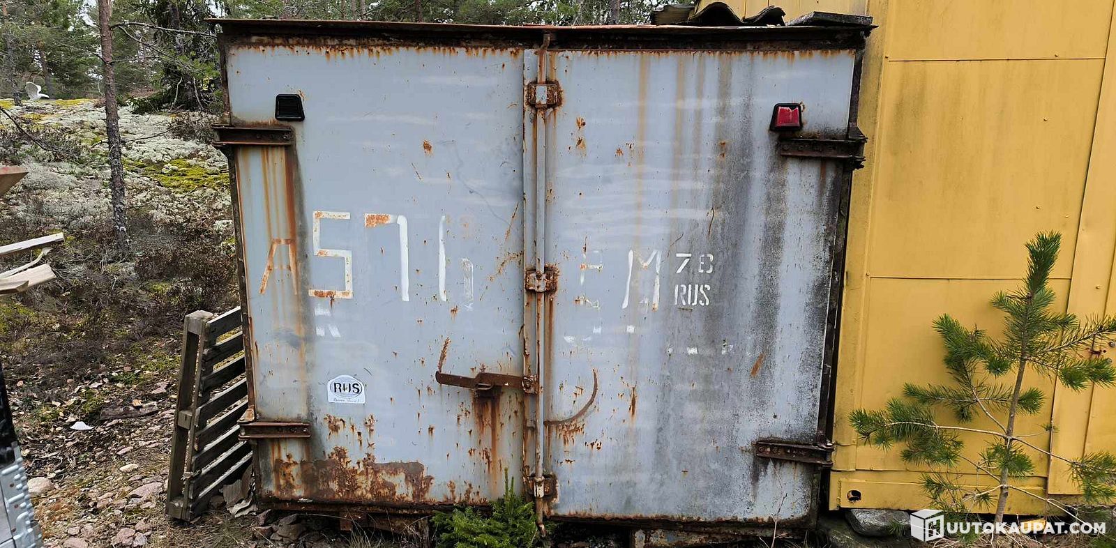 Tavarakontin N. 313 x 200cm Rahtikontti - Varasto - Metallikontti täynnä aarteita esim. Wanhojen autojen osia, pyöriä yms. ENITEN TARJOAVALLE, Vehmaa