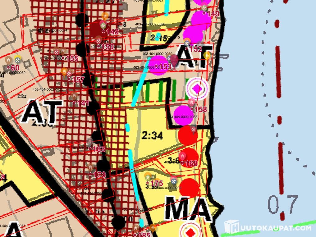 Rantavyöhykkeen raja on merkitty sinisellä katkoviivalla. Rantarakentamisen tulee tapahtua rantavyöhykkeen ruskealla AT-alueella.