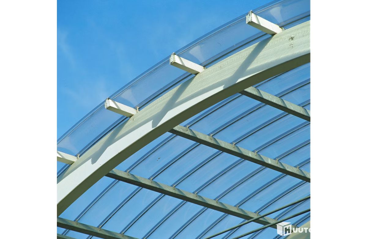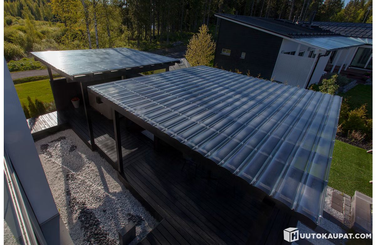 Kestävästä polykarbonaatista valmistettu Fastlock Uni -valokate suojaa sateelta mutta päästää auringonvalon sisään. Putkisaumakiinnitys mahdollistaa kiinnityksen ilman reikien tekemistä katteeseen sekä myös kaarevien muotojen rakentamisen. Fastlock Uni -valokatteen hyötyleveys on 20 cm. Iskunkestävä ja pitkäaikainen materiaali kestää pakkasen, lumikuorman ja rajutkin myrskyt. Kate on sileä ja likaahylkivä, joten se on helppo pitää puhtaana. Valokate sopii hyvin terassille, pergoloihin, auto- ja pyöräkatoksiin ja pihavarastoihin, kotiin, mökille ja liikerakentamiseen. Säilyttää kauniin muotonsa ja värinsä haalistumatta. • materiaali: polykarbonaatti • valonläpäisykyky: kirkas 72 % • levyn leveys/hyötyleveys: 216 mm/200 mm • paino: n. 1,9 kg/m² • paksuus: 1 mm • profiilikorkeus: 26 mm • ruodeväli: max. 600 mm (ruoteen keskeltä keskelle) • lumikuorma ruodejaolla k600: 1,8 kN/m² (n. 180 kg/m²) • tuulikuorma: 2,0 kN/m² • ruodekoko: min. 45 x 45 mm • kaltevuus: min 25 mm/m (1:40) • taivutussäde kaarevissa katoissa: min 1500 mm • UV-suojattu Katteen alusrakenteeksi sopivat puiset ja teräksiset sekä alumiiniset rakenteet. Fastlock Uni -valokate on paloluokiteltu tuote (EN 13501-1: B-s1, d0). VALOKATTEEN MENEKKI Levyn hyötyleveys 200 mm + 20 mm katetun alan toisessa reunassa. Esim. 4 m leveään katokseen tarvittava levymäärä lasketaan seuraavasti: 4 m / 0,2 m = 20 levyä. VALOKATTEEN ASENNUS Fastlockin valokatepaneelit on suunniteltu siten, että niiden asennus on yksinkertaista, helppoa ja turvallista. Levyt liitetään aina putkisaumoista toisiinsa. Ruoteisiin levyt kiinnitetään Fastlock -muovikiinnikkeillä, jotka asennetaan ruoteisiin ennen valokatteen kiinnitystä, jolloin kiinnikkeet eivät jää lainkaan näkyviin. Levyjen työstö onnistuu esimerkiksi hienohampaisella sahalla. Katon kaltevuuden on oltava vähintään 25 mm/metri. Kun kaltevuus on 10° (1:6) tai enemmän, valumisen estämiseksi jokainen levy kiinnitetään ruuvilla yläreunasta ylimpään ruoteeseen joka toisen putkisauman läpi. Ruoteet on suositeltavaa suojata maalaamalla. Ainakin ruoteen yläpinta on maalattava vaalealla, sillä tumma pinta voi kuumetessaan aiheuttaa muutoksia muovissa. Ennen asennusta levyistä on poistettava irrotettava suojamuovi. Lue asennusohjeesta tarkemmin Fastlock Uni -valokatteen asennuksesta.