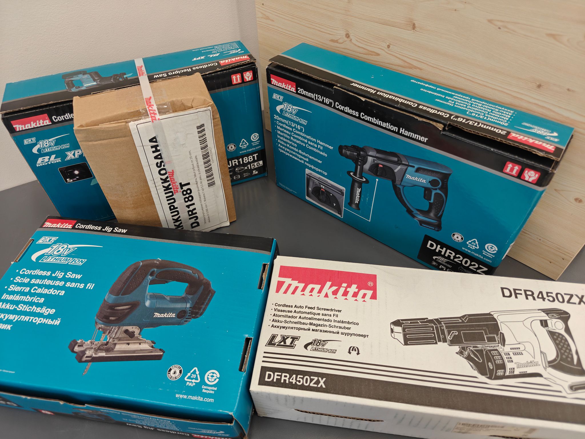 Makita akkukonesetti. 4 akkukonetta: pistosaha (runko), nauharuuviväännin (runko), akkupuukkosaha pikalaturilla ja 5Ah akulla, sekä akkuporavasara (runko)., Joensuu