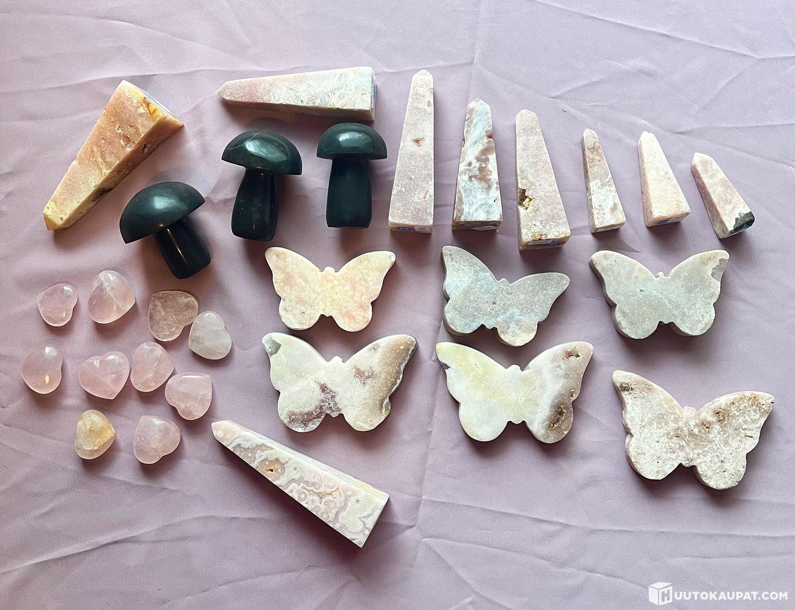 Kristallit: vaaleanpunainen ametisti perhonenx6, v.pun ametisti torni x9, ruusukvartsi sydän x10, basalttisieni x3, Kolari