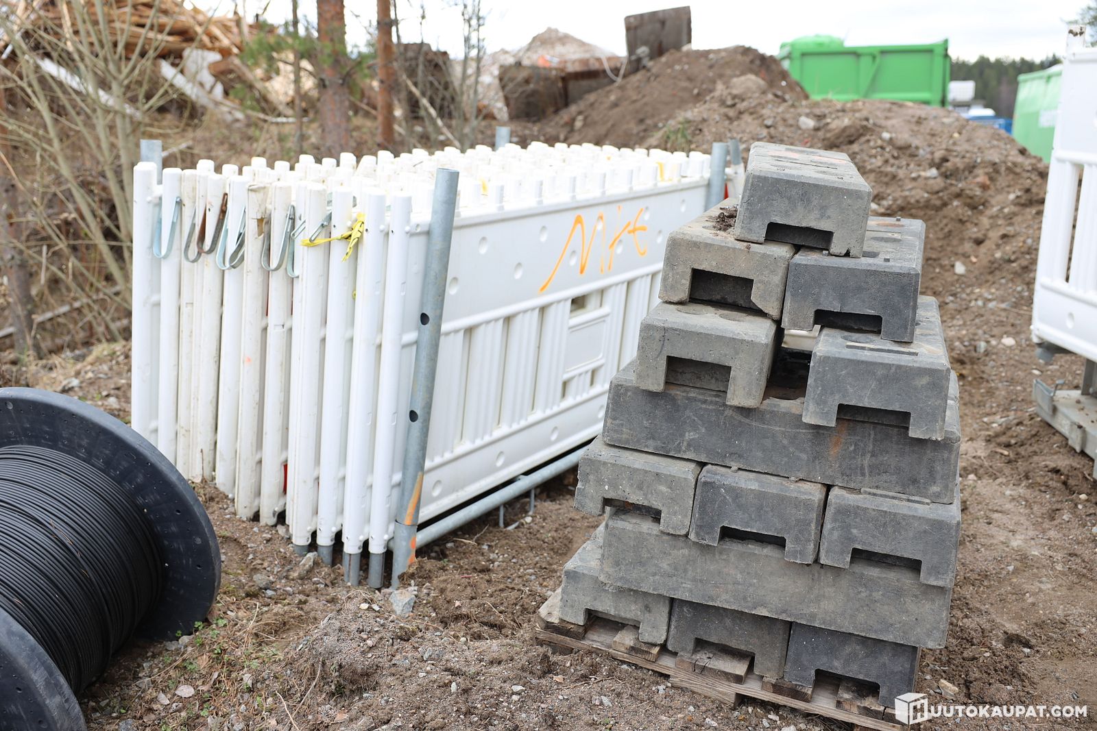 Työmaa-aitaa n. 21 kpl , paino 15 kpl ja teline (11). MRT Infra Oy konkurssipesä (1461268-1), Jyväskylä