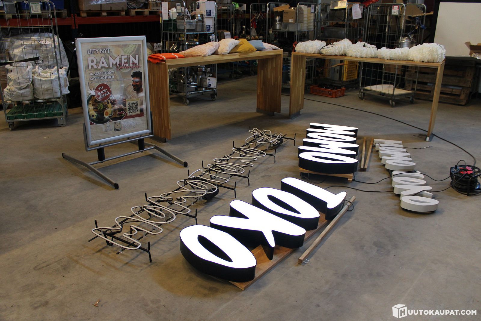 Pöytä 2 kpl, valomainos, riippuvalaisin 5 kpl, tyynyjä, mainoskyltti (MT7) Cathywong Oy konkurssipesä (2696127-2), Kirkkonummi