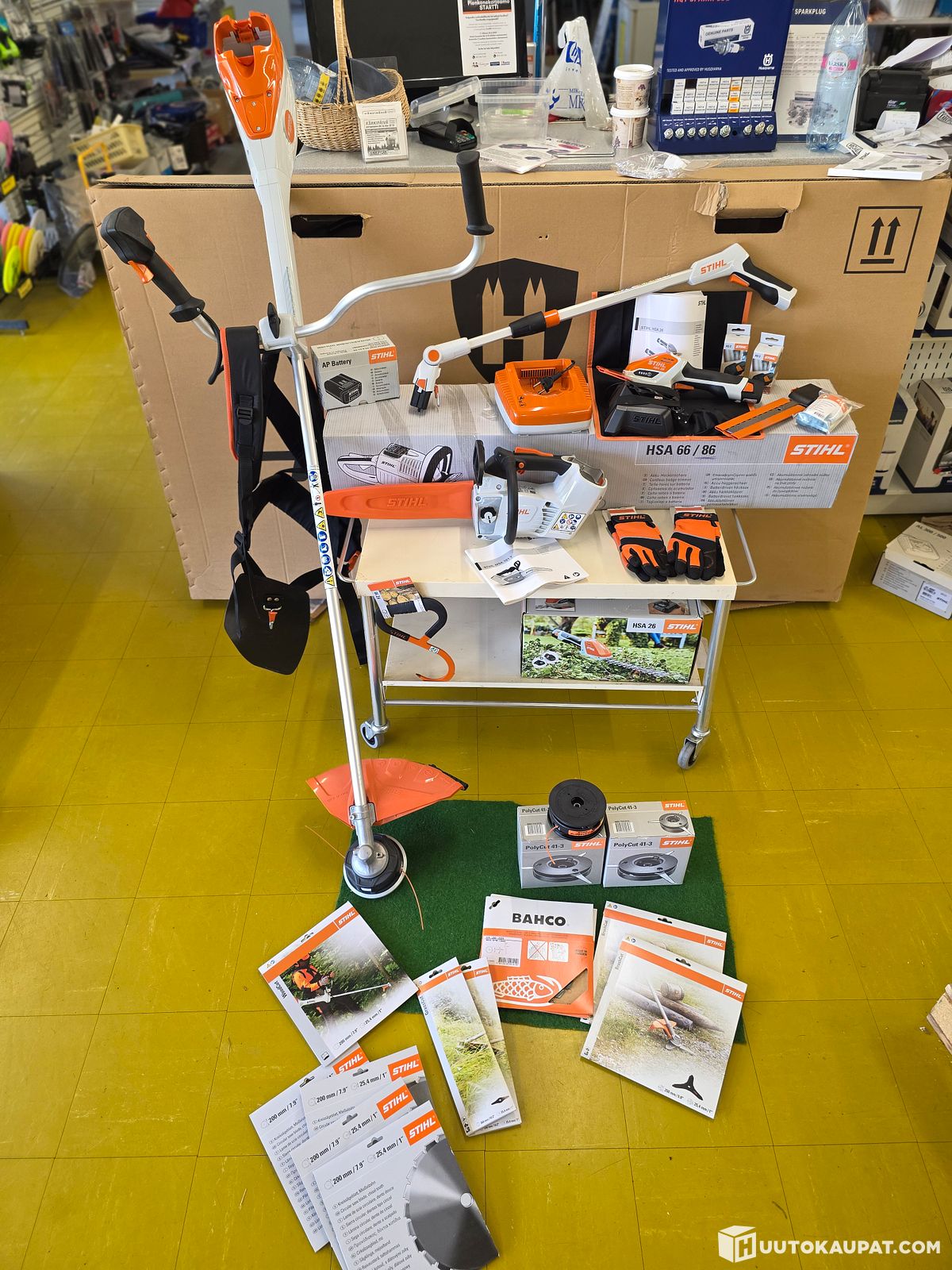 Erä 13. STIHL akkukäyttöisten puutarhakoneiden kokonaisuus runsaine lisävarusteineen, Mäntyharju