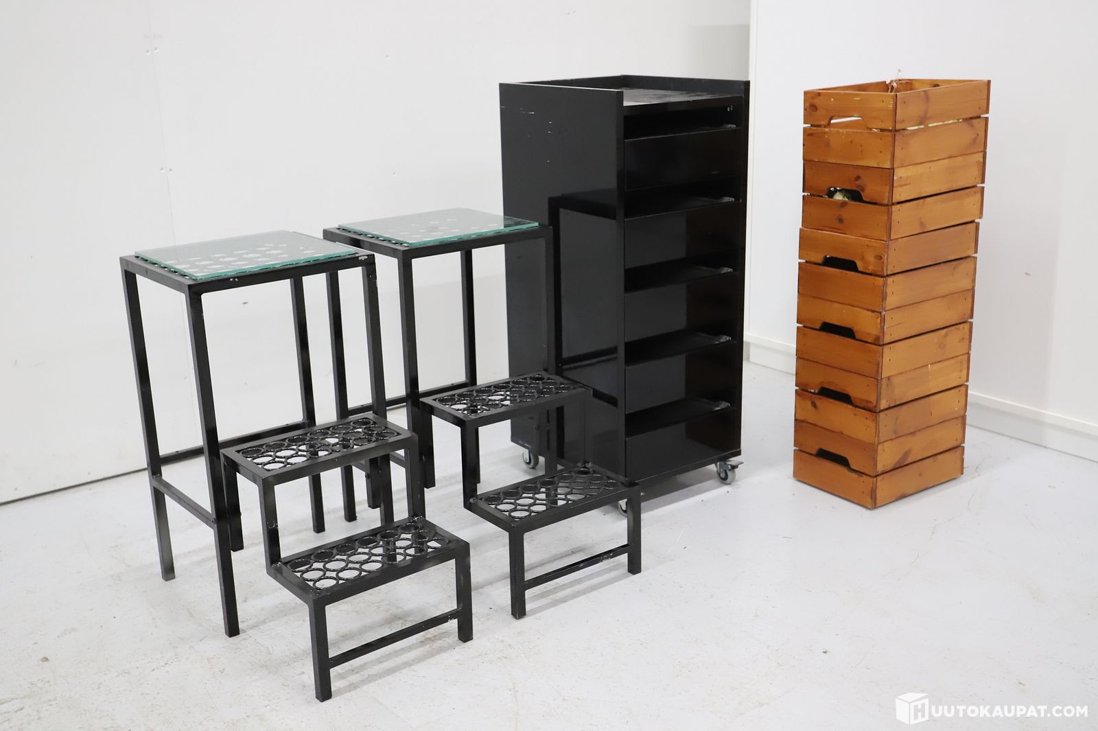 Lasikantisia tasoja, korkeakiiltoinen vetolaatikosto ja "kukkapylväs". PRT565, Helsinki