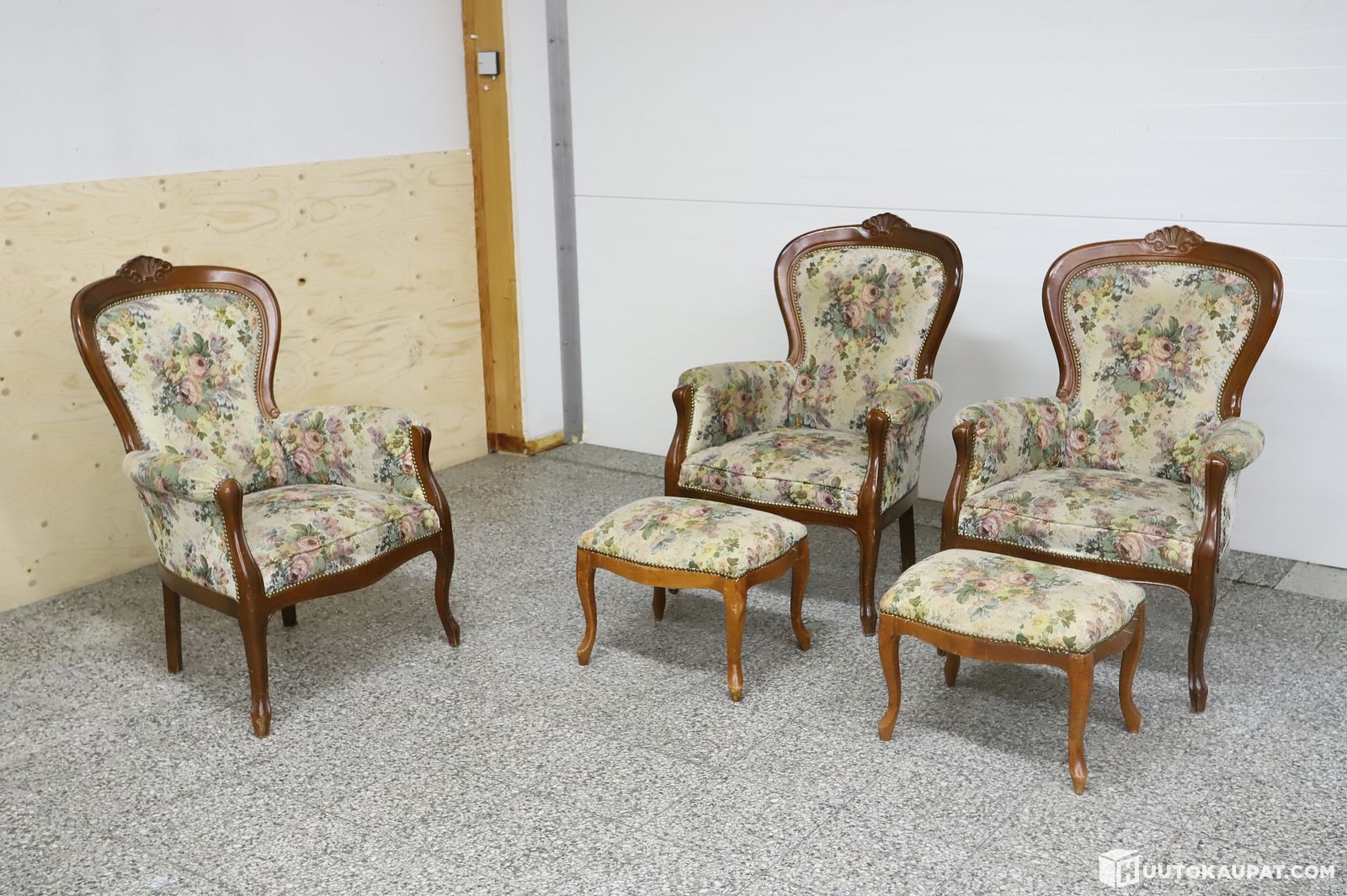 Nuova Ital Salotti rokokoo-nojatuolit 3 kpl ja rahit 2 kpl. KRK4458, Hausjärvi