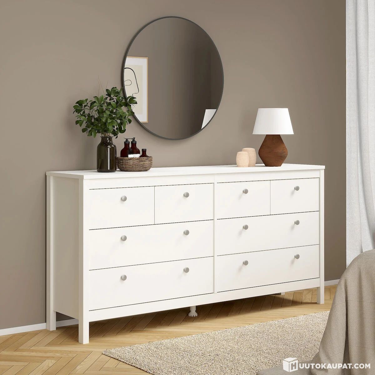 Madrid 4+4 lipastossa on yhteensä 8 laatikkoa, 4 isoa ja 4 pienempää, joissa on kauniit vaihdettavat vetimet. Lipasto on omiaan lastenvaatteille, liinavaatteille, eteiseen ja kaikkiin muihinkin kodin kuiviin tiloihin. Kannen päälle jää runsaasti tilaa kauniille sisustusesineille. Laatikot tulevat 21,7 cm ulos ja mittatiedoissa on ilmoitettu vetolaatikoiden sisämitat. Säilytystilan mitoissa on isompien laatikoiden sisämitat ja vetolaatikkojen mitoissa pienempien sisämitat.