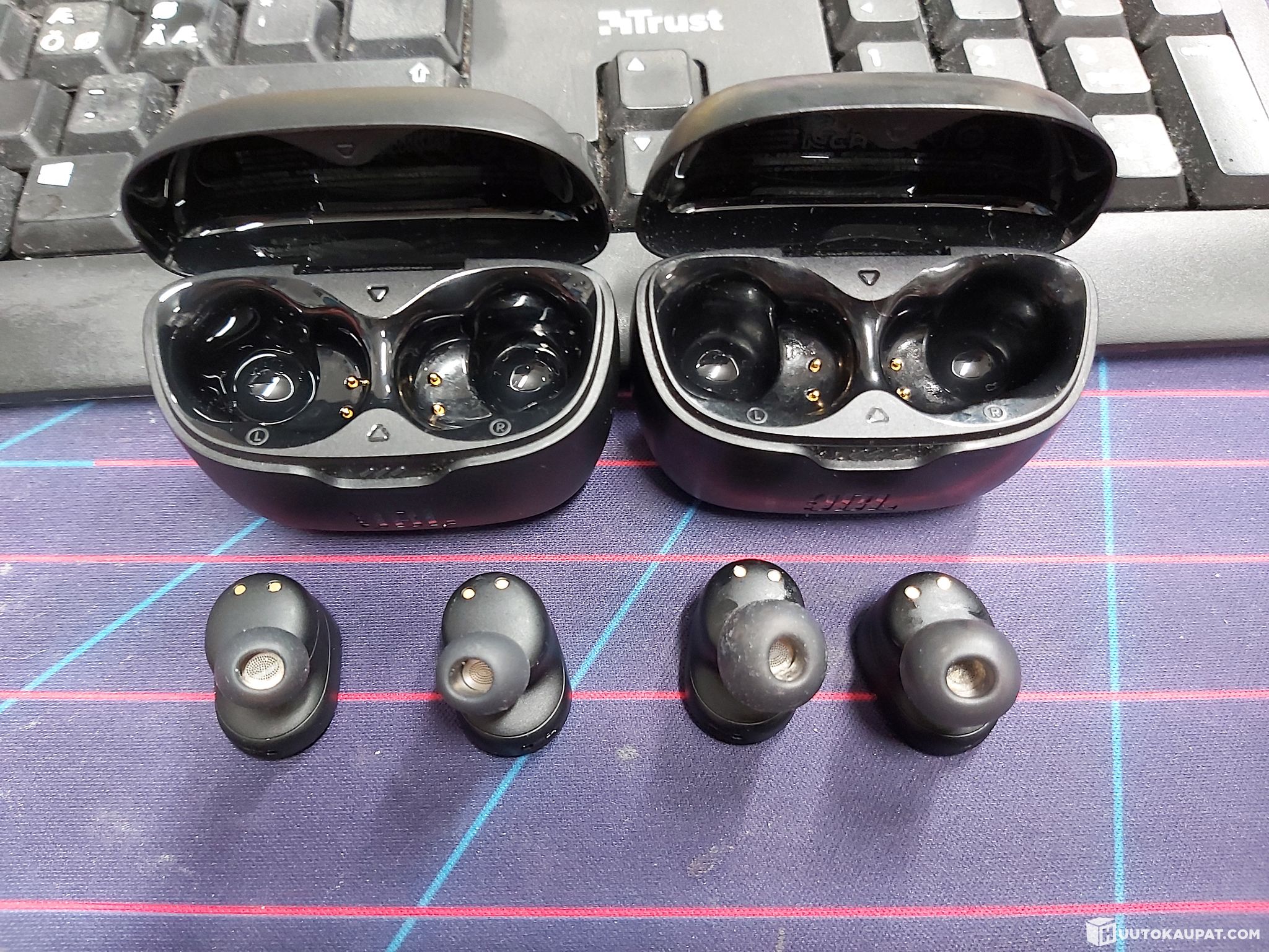 Käytettyjä, mukana napit, latauskotelot ja laturit.