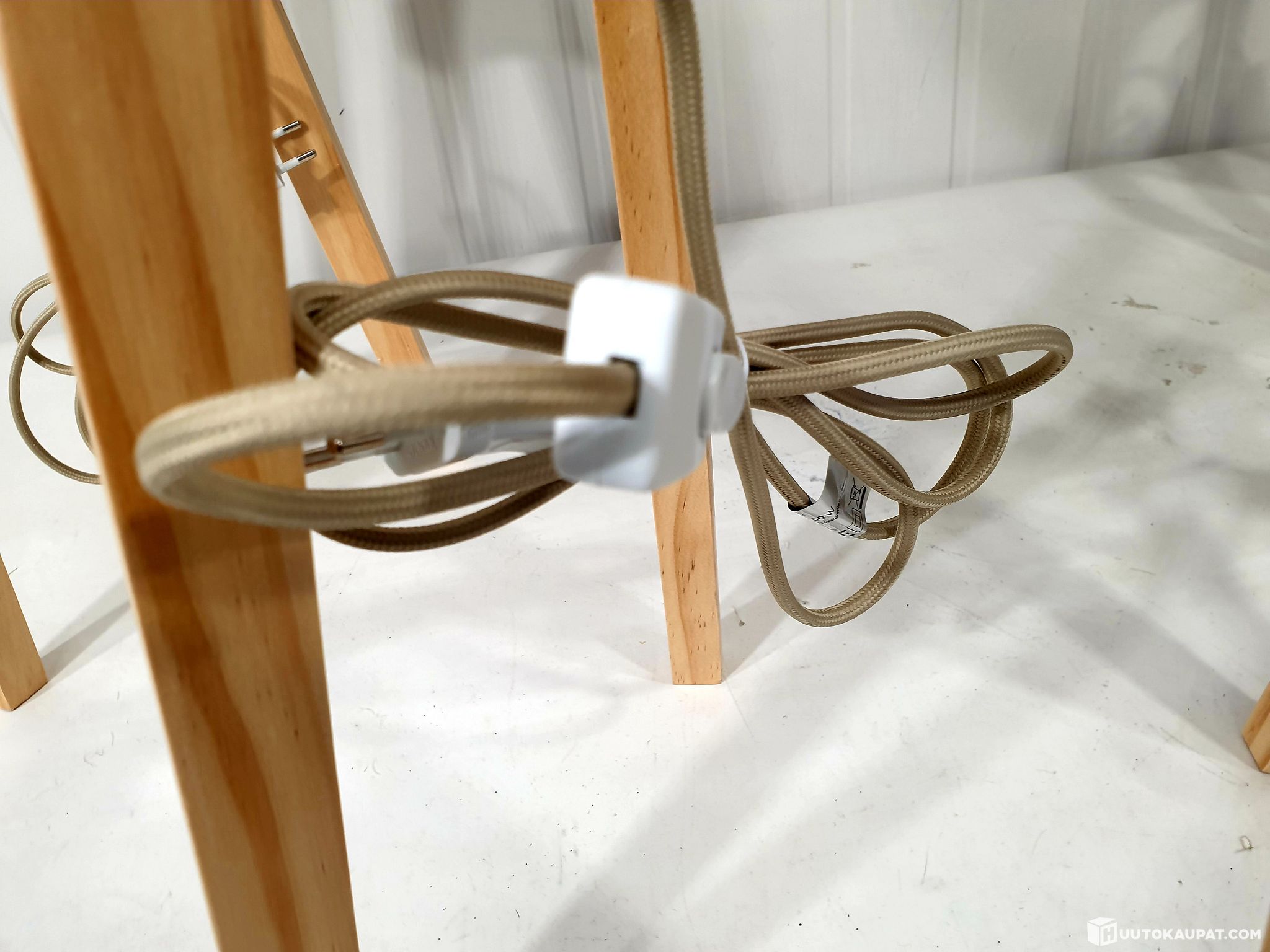 Beige tekstiilipäällysteinen johto.