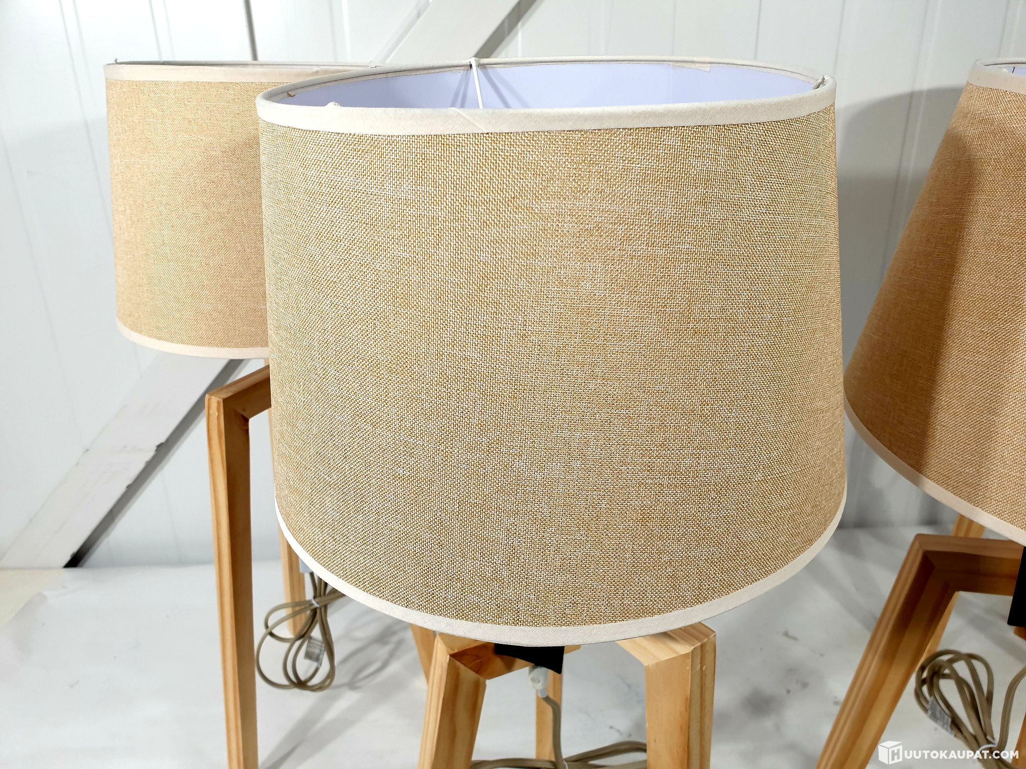 4 kpl tyylikkäitä pöytävalaisimia kauniilla pellavavarjostimella ja kolmijalalla.