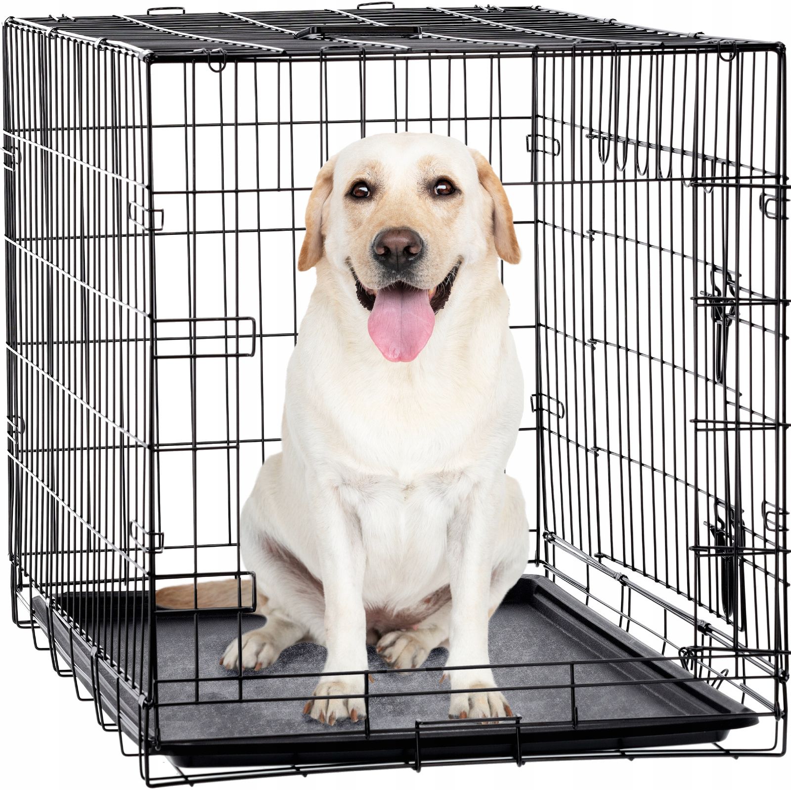 Tukeva koiranhäkki koossa XXL, mitat 107 × 69 × 75,5 cm. Varustettu liukuvalla alustalla helppoa puhdistusta varten ja irrotettavalla kahvalla kätevää kuljetusta varten. Ihanteellinen suurille koirille ja tarjoaa turvallisuutta ja mukavuutta kotona, matkoilla tai koulutuksen aikana.