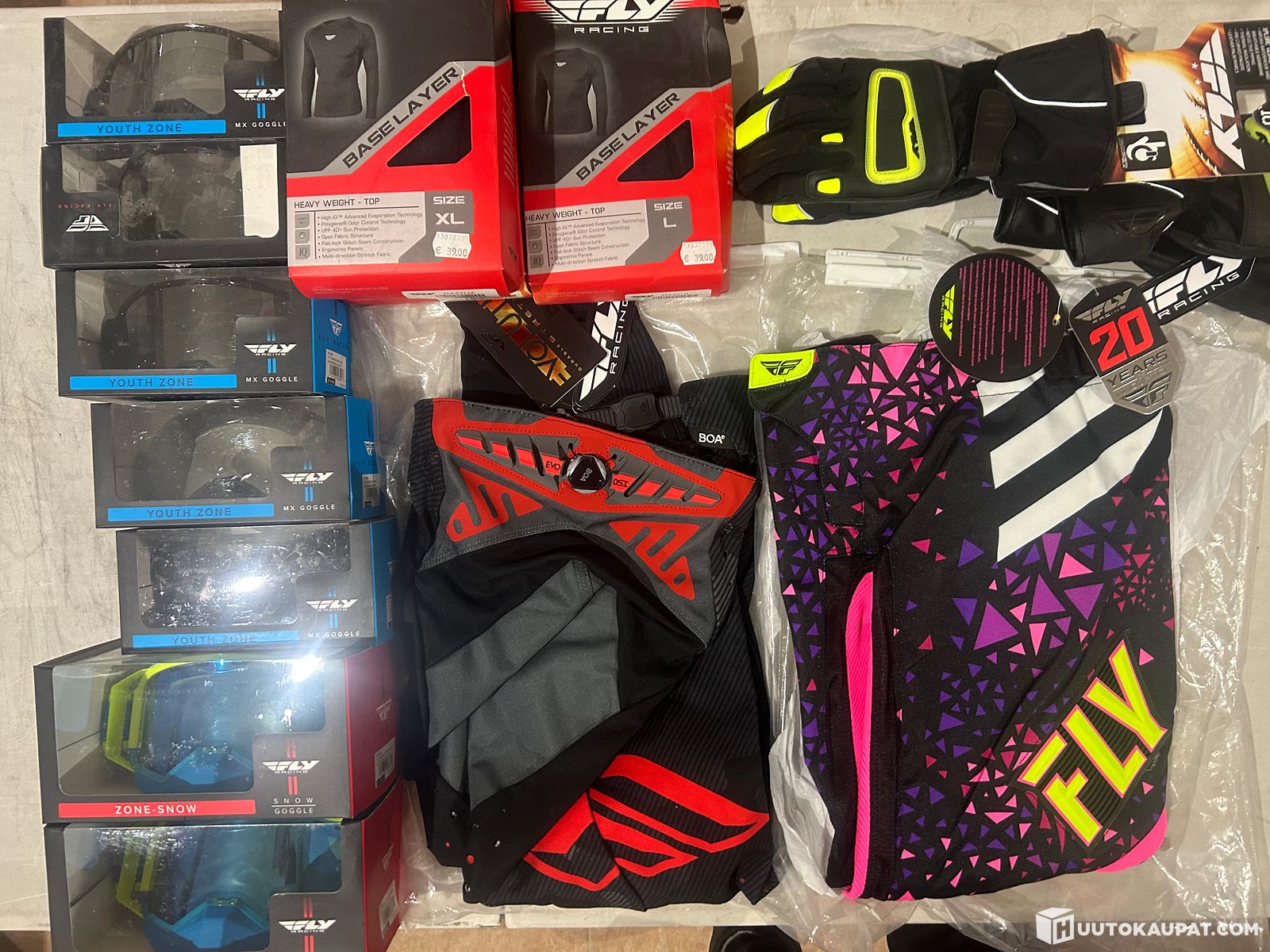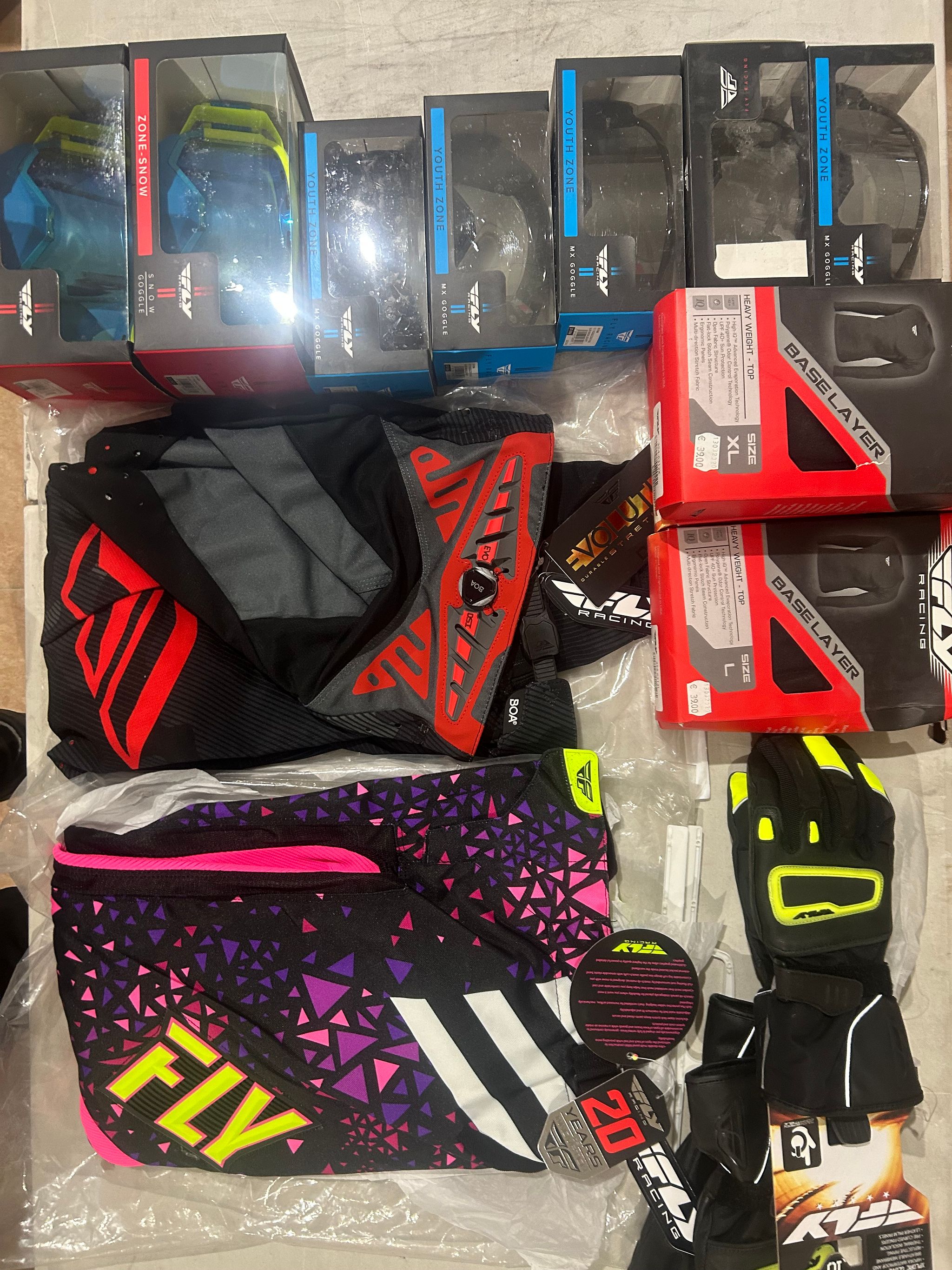 14 kpl loppuerä Fly Racing Ajolaseja, crossihousuja , kelkkahanskoja ja paitoja erän sh.reilu 800,00€, Mikkeli