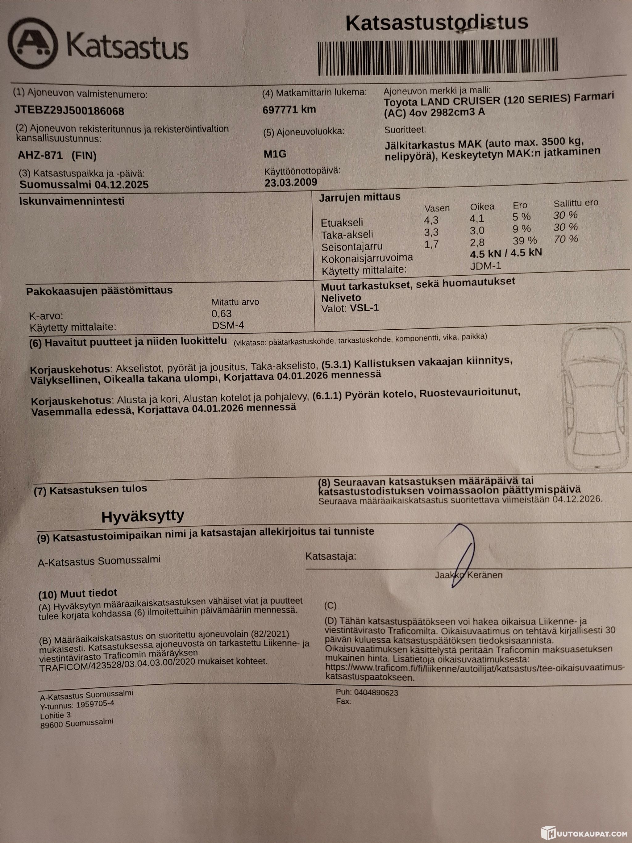 Katsastuksessa ilmeni kaksi korjauskehotusta, jotka jäävät ostajan vastuulle. Korjattavat kohdat näkyy katsastustodistuksen kuvassa.