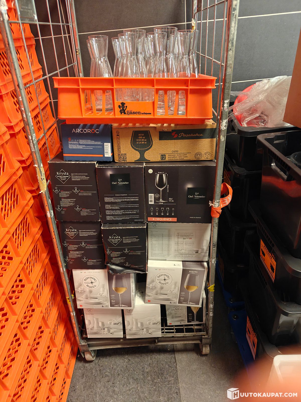 Viinilaseja 80+ kpl, tulppaanilaseja 80+ kpl, aromilaseja 32 kpl ja karahveja 15kpl, Jyväskylä