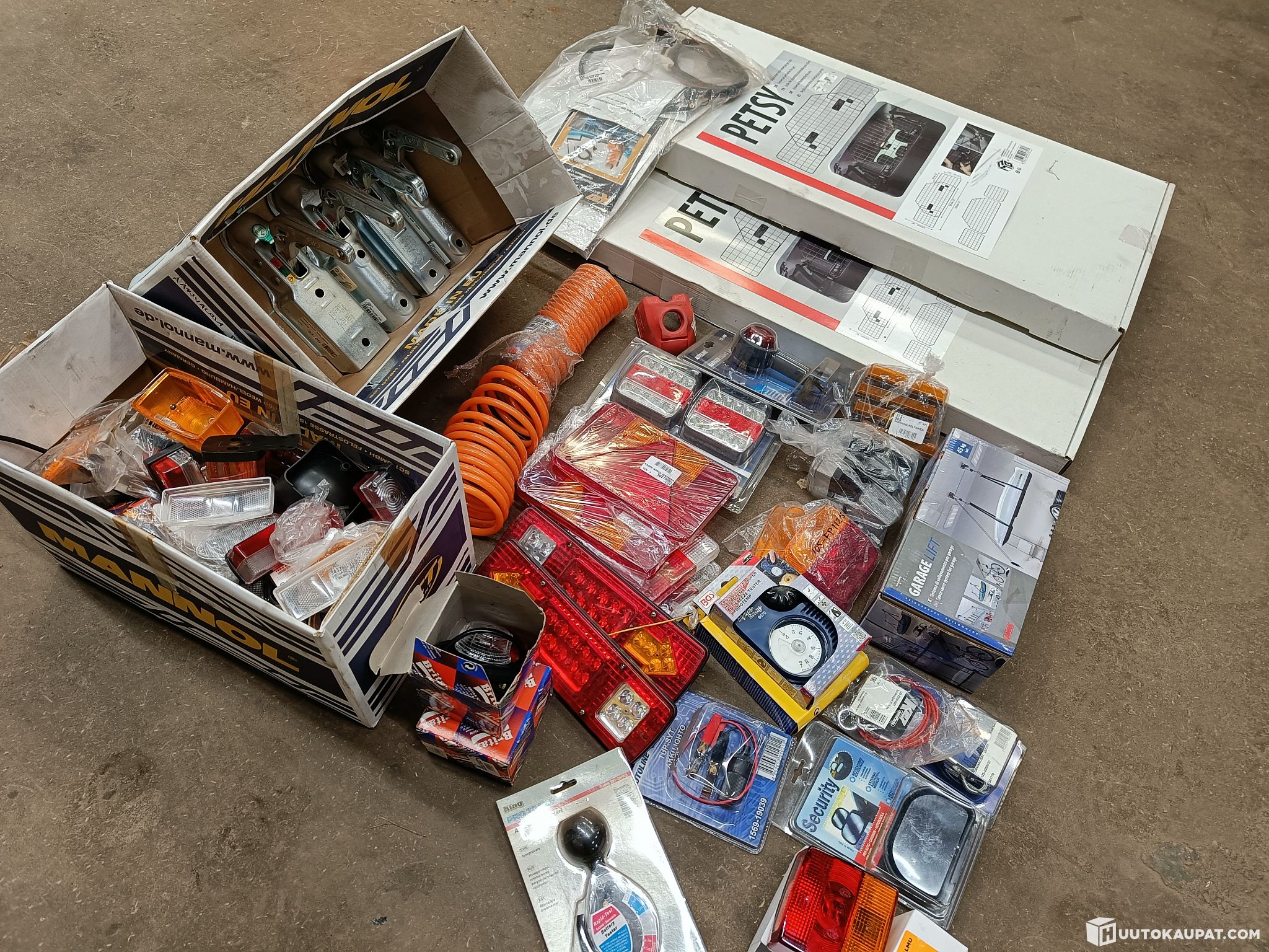 Peräkärryn valoja, varalaseja, kuulakytkimiä, varastovinssisysteemi suksiboksille, 2kpl koiraverkkoja autoon, istuinlämmitin yms. autotarviketta.