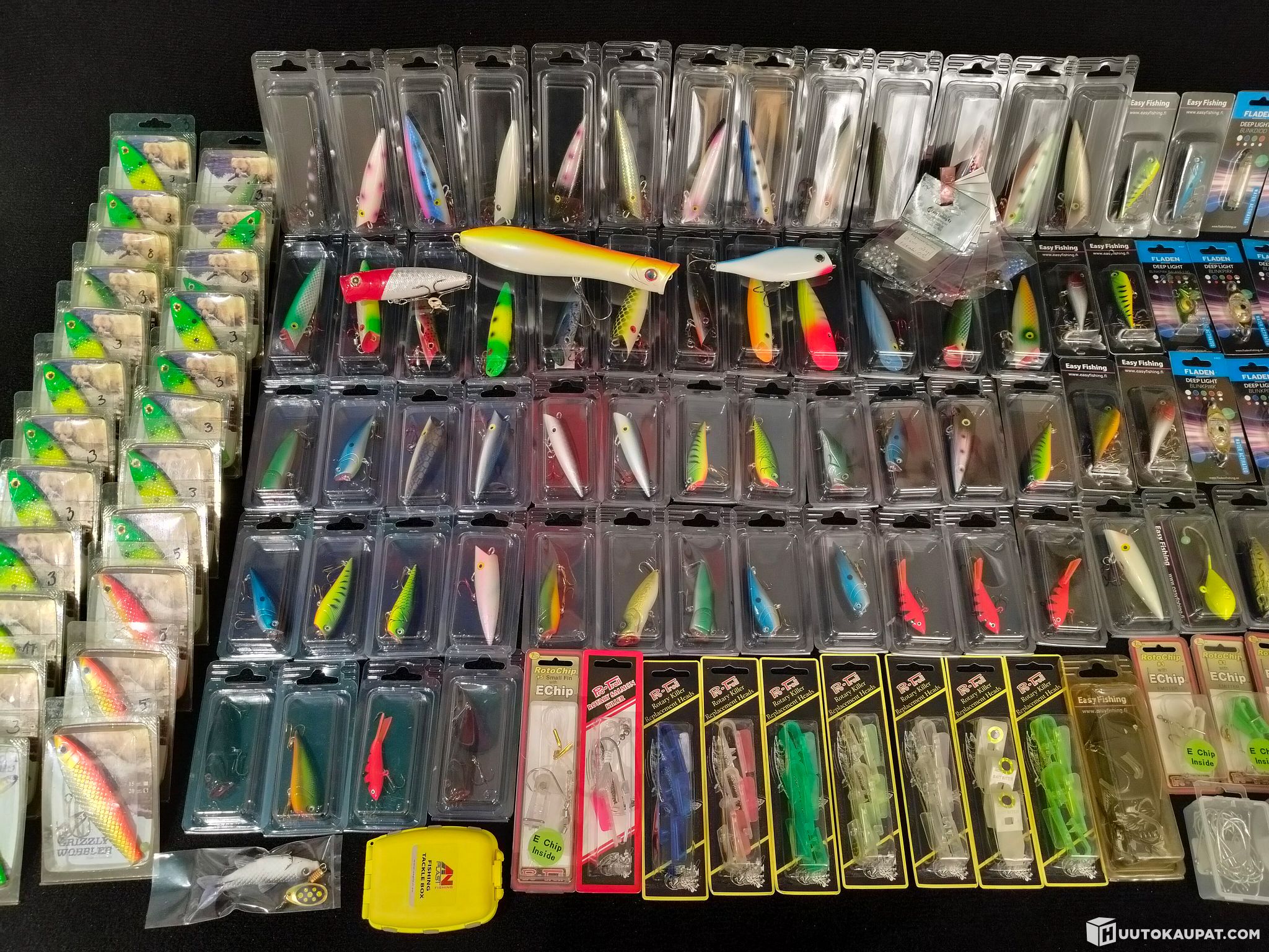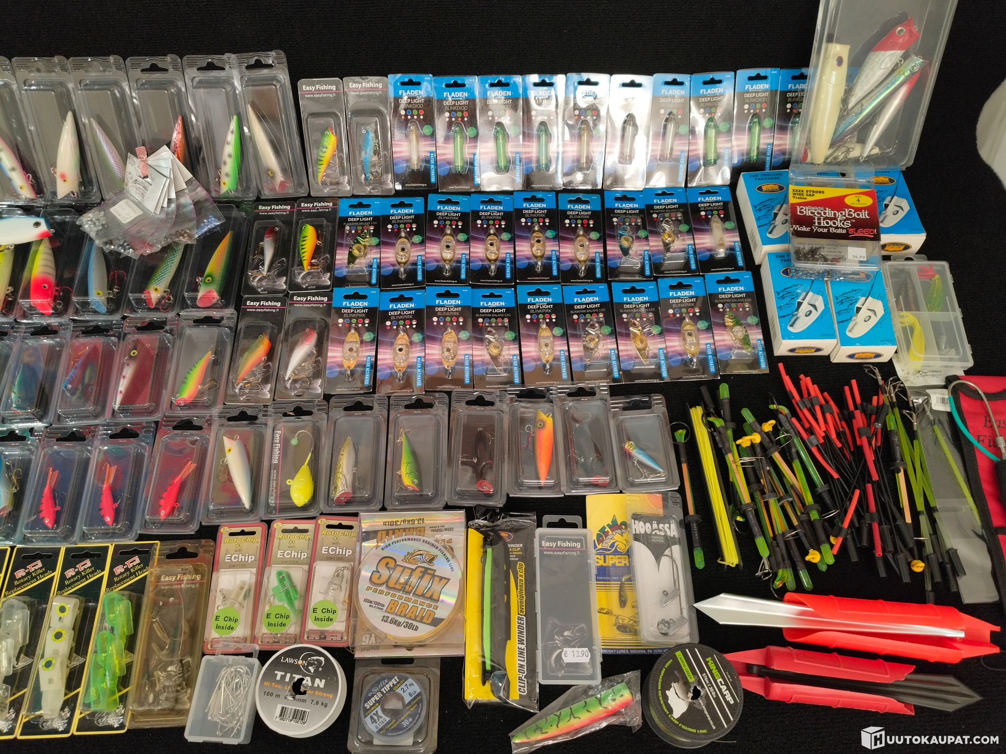 Valtava ja monipuolinen viehe- ja tarvikekokonaisuus, joka on koottu suoraan tukkuliikkeen varastolöydöistä. Kaikki tuotteet uusia. Mukana mm. vaappuja, jigejä, lippoja, valovieheitä, siimoja, koukkuja, heittopainoja, tärppikelloja, tarvikelaatikoita sekä Fladenin Deep Light -valoja ja tarvikkeita.
