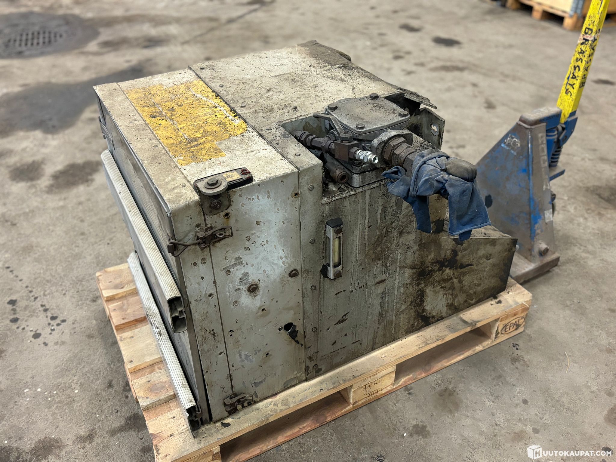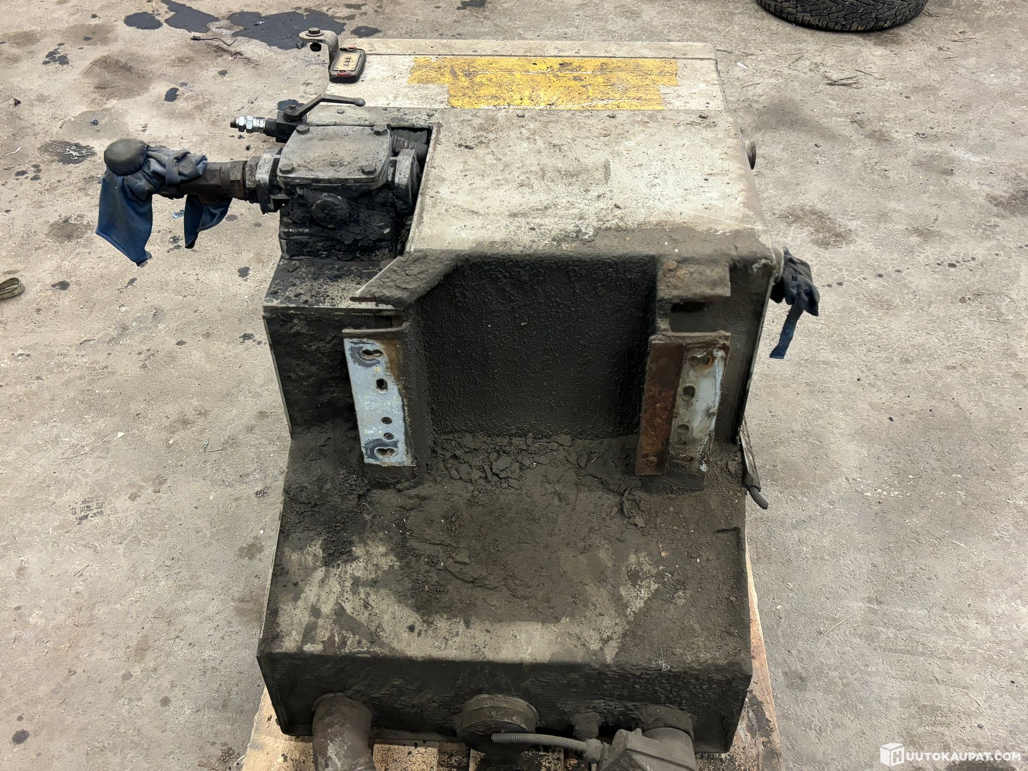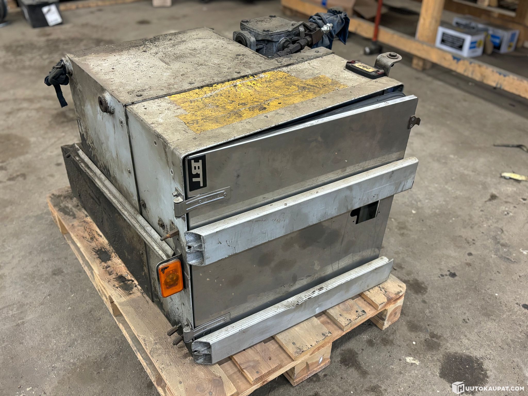 Puu-Autosta irroitettu Alucar Hydrauliöljysäiliö/tarvikelaatikko yhdistelmä.