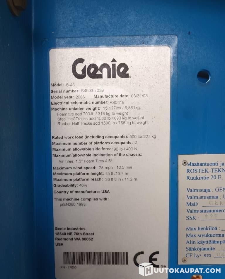Suora teleskooppipuominen Genie S-45 kuukulkija. 4WD, tarkastukset voimassa. Hyvässä työkunnossa. Leveä työkori.