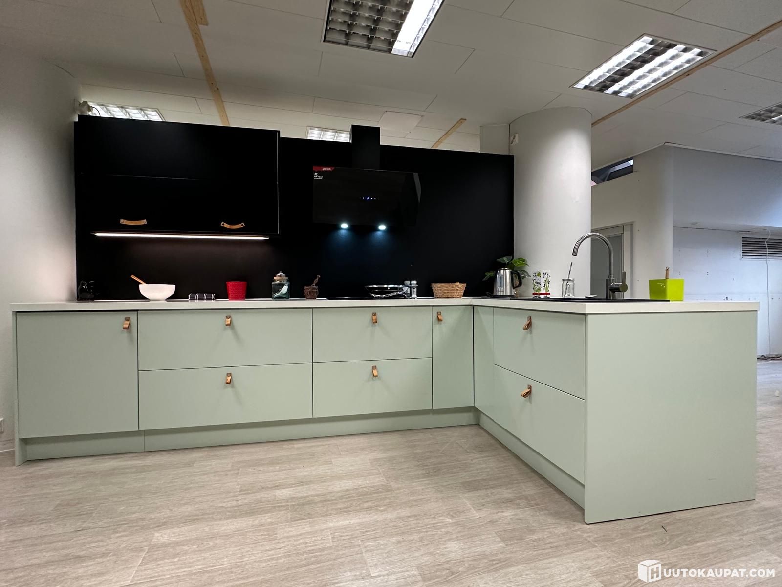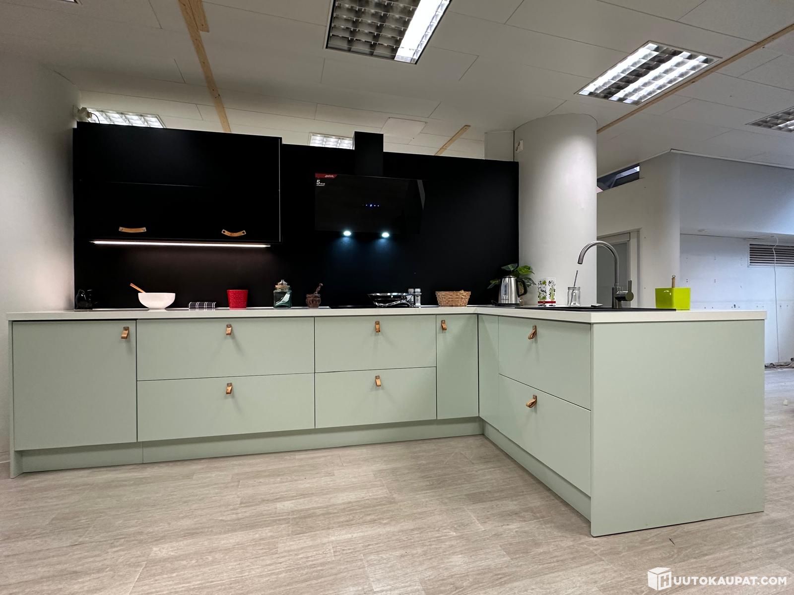 Ideal Keittiö Silo uusilla kodinkoneilla, altaalla ja hanalla varustettuna (malliryhmä). Yksinkertainen on kaunista, Silo on klassinen maalattu ovi. Mustan, valkoisen ja pastellinvihreän persoonallinen yhdistelmä nahkavetimillä. Pastellinvihreä väri tekee keittiöstä raikkaan sekä ilmavan, ja sopii mainiosti yhteen mustan ja valkoisen kanssa.