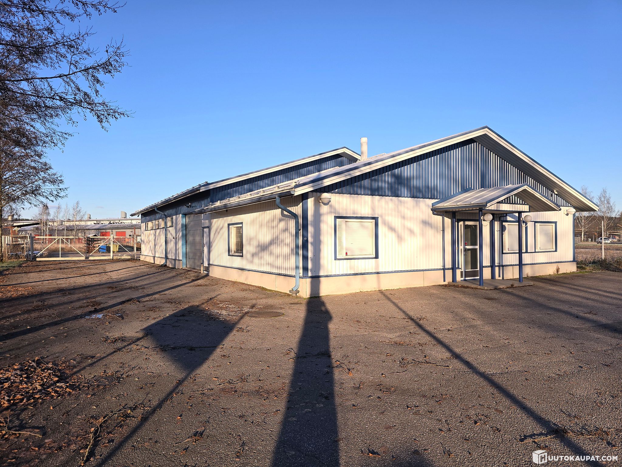 Asfaltoitu, tontin perällä alue aidattu, sähköportti.
