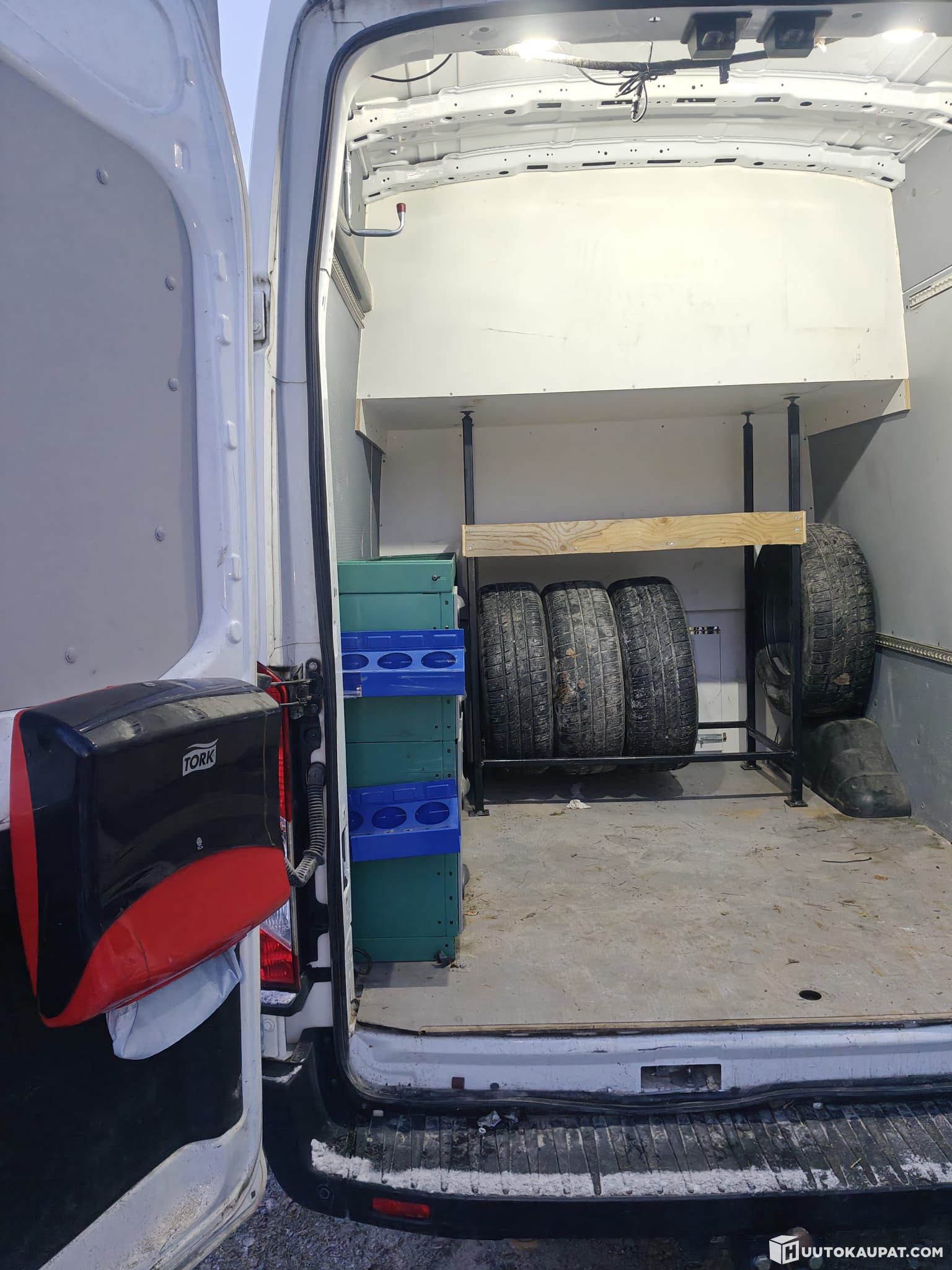 -Takana työkaluhylly vetolaatikoilla ja irroitettava rengasteline.