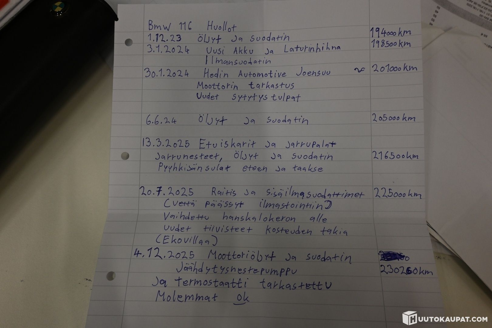 -Digitaalinen huoltohistoria ja osa kuitteina/paperilla
