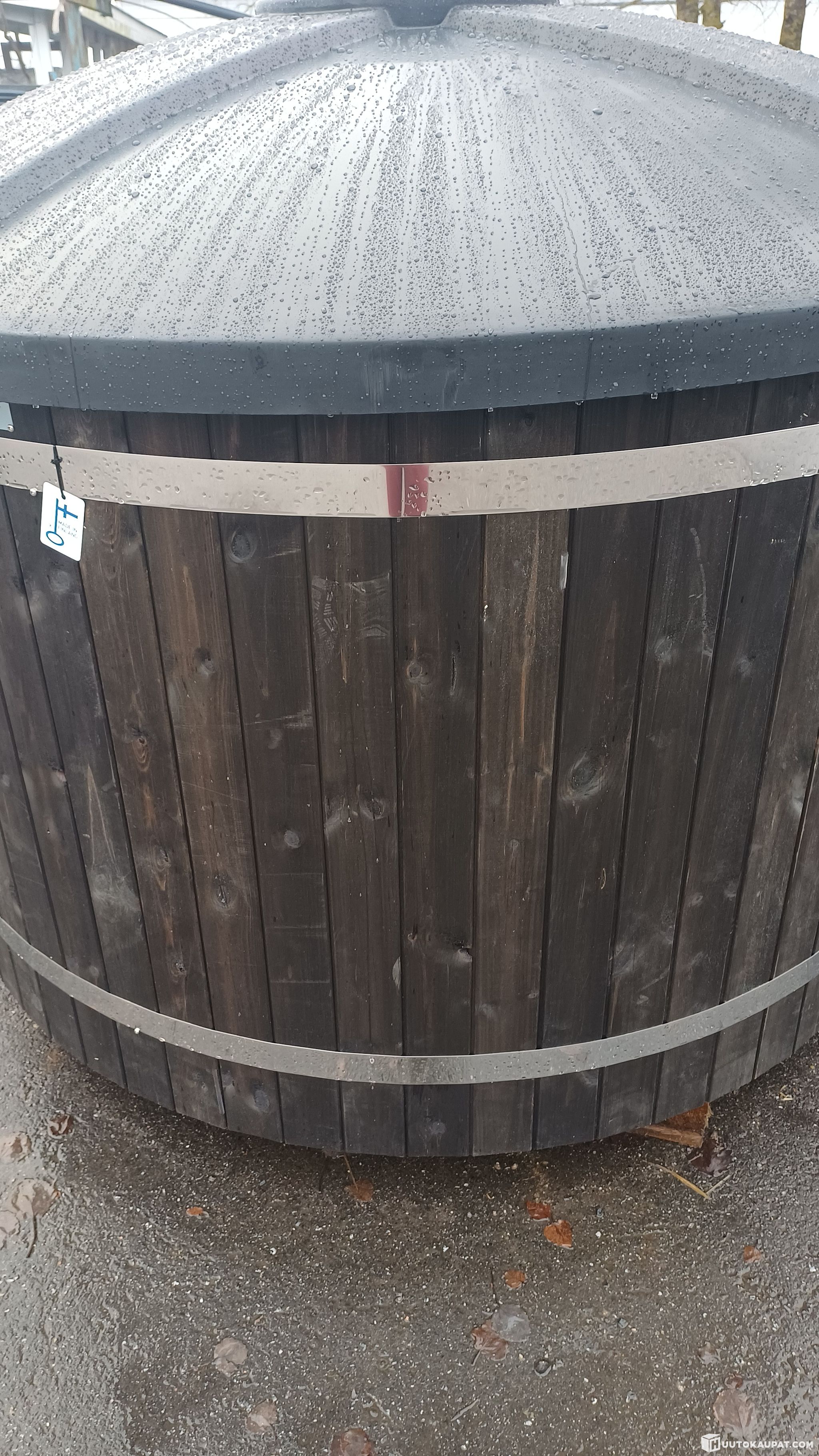 Nyt huutokaupattava kylpytynnyri on kylpyvalmis paketti. Se on suunniteltu 6-8 hengelle ja on ulkohalkaisijaltaan noin Ø180 cm. Kylpytynnyripakettiin kuuluu vankka PE-muovinen kansi sekä merialumiininen kamiina piippuineen ja letkuineen.