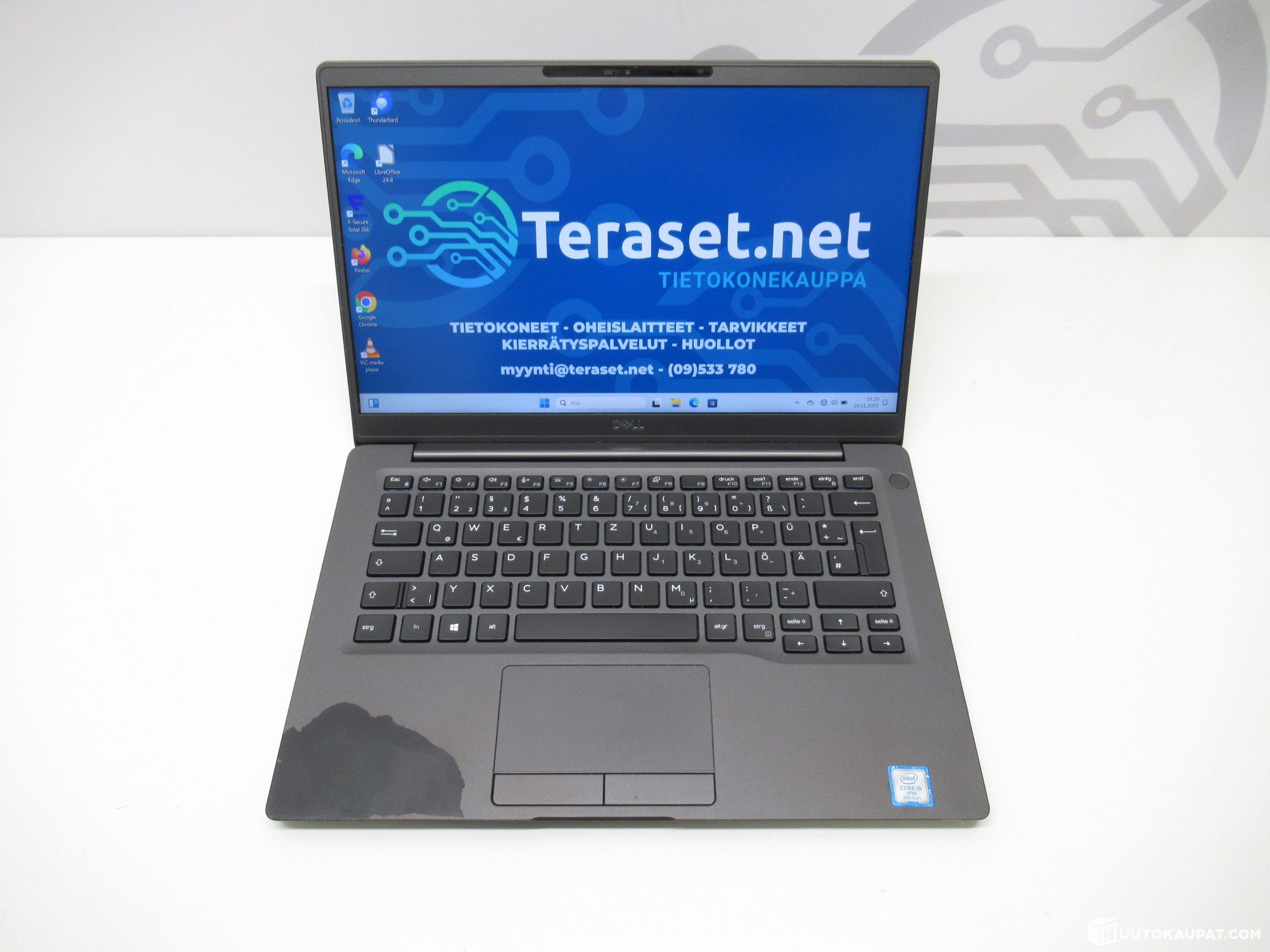 B-laatu: laitteen rungossa, wrist restissä, touchpadissa ja näppäimistössä käytönjälkiä. Näppäimistö QWERTZU-asettelulla.