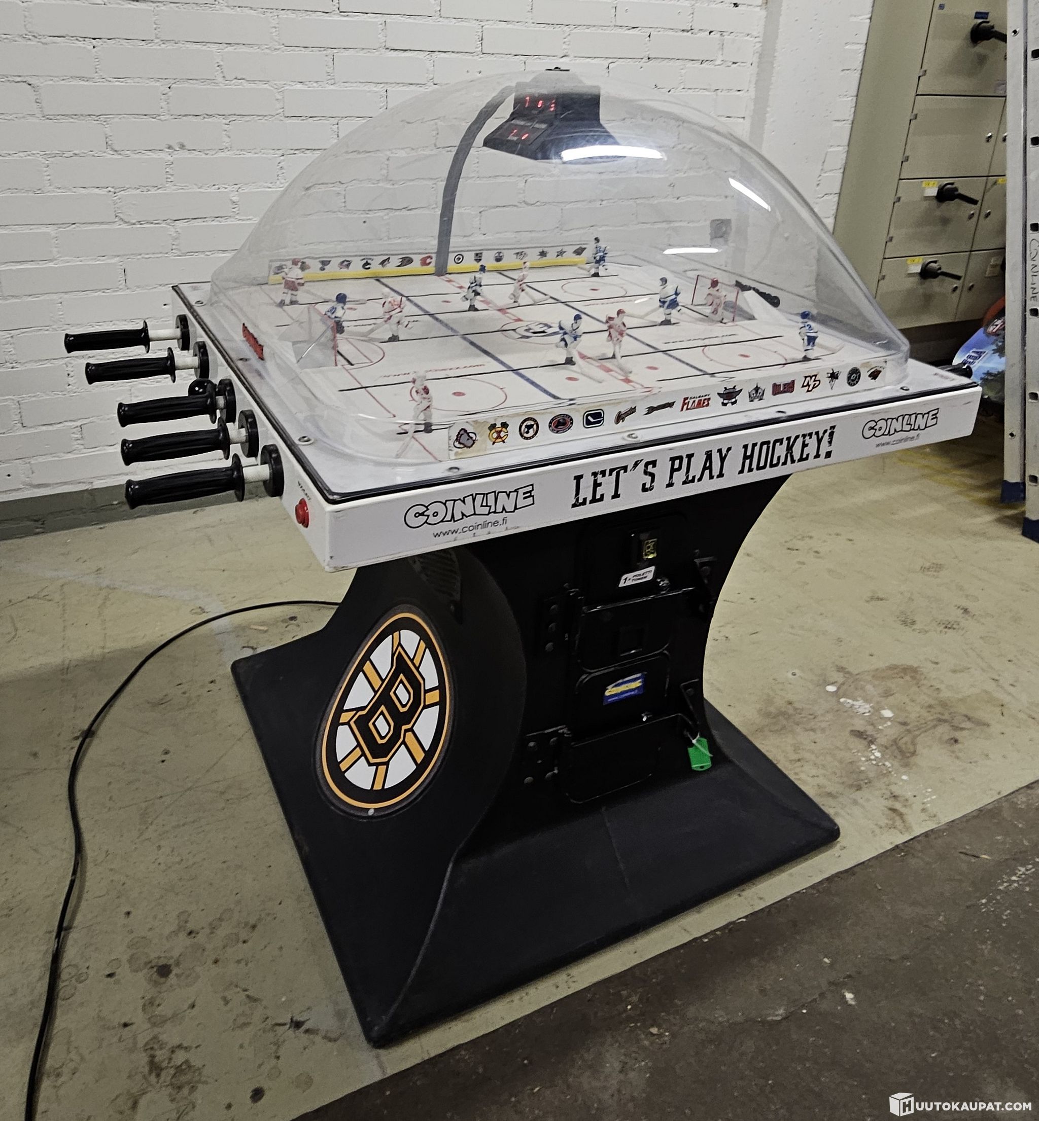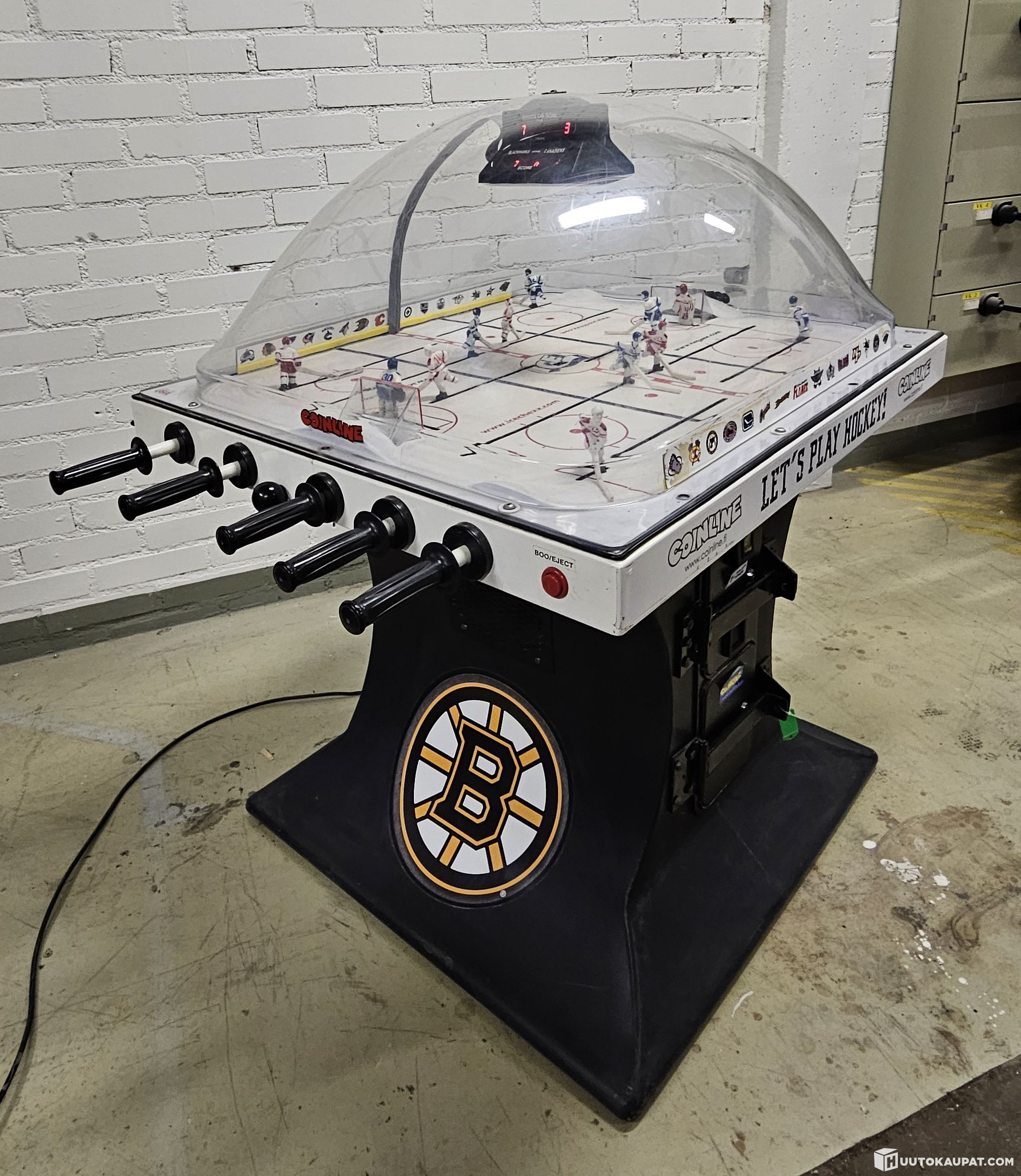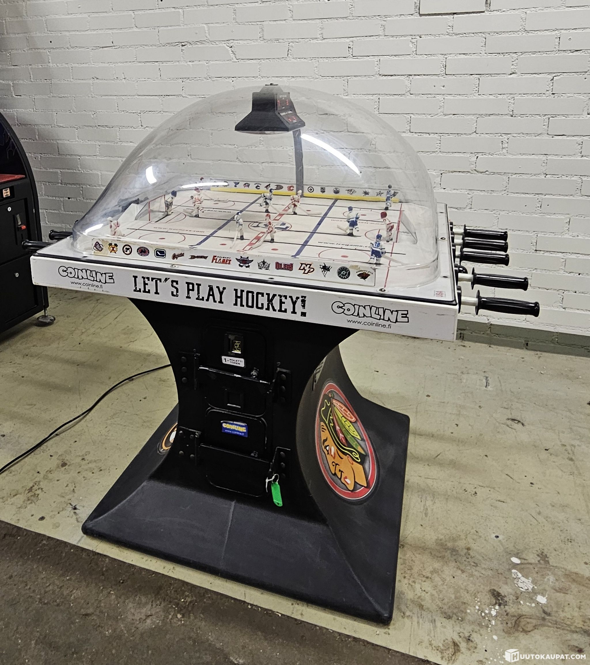 Super Chexx Pro -pöytäjääkiekko on esimerkiksi sporttibaareista tuttu, mahtavan mukaansatempaava peli. Tämä on keskimäärin yhtä viihdyttävä kuin “perus Stigan” -pöytälätkä kertaa kaksisataa. Laite soittaa aluksi yhdysvaltain kansallislaulua, jonka jälkeen kiekko pomppaa keskellä olevasta kolosta kentälle ja vauhdikas peli alkaa! Laite laskee maalit ja syöttää uuden kiekon aina maalin jälkeen. Pelin kesto noin kolme minuuttia. Laitteen jalassa on NHL-teippaukset (Chicago Blackhawks & Boston Bruins). Tuote on kuvien mukaisessa kunnossa.