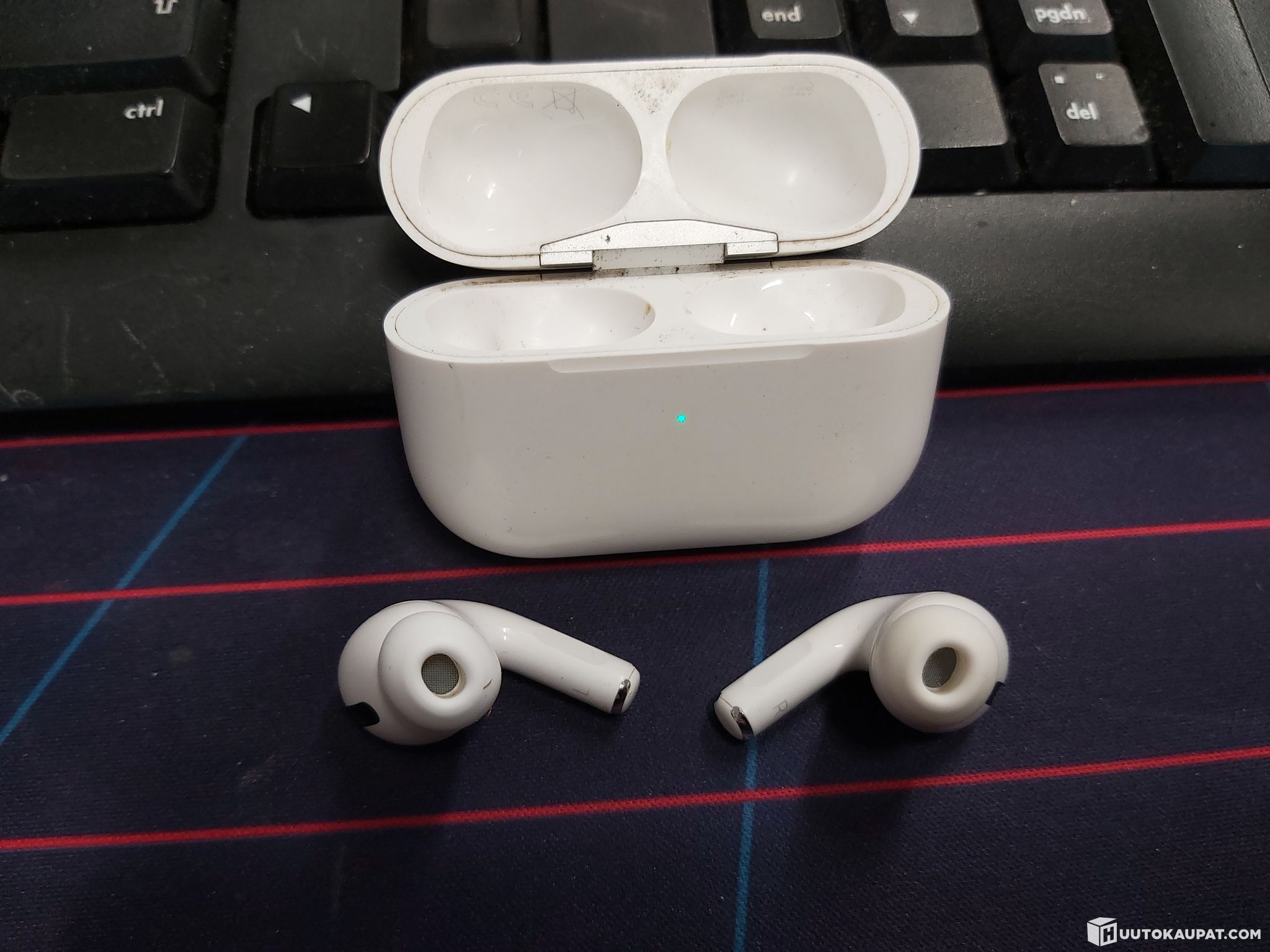 Käytetyt. Mukana napit, latauskotelo ja laturi. Korvapehmusteet kokoa M