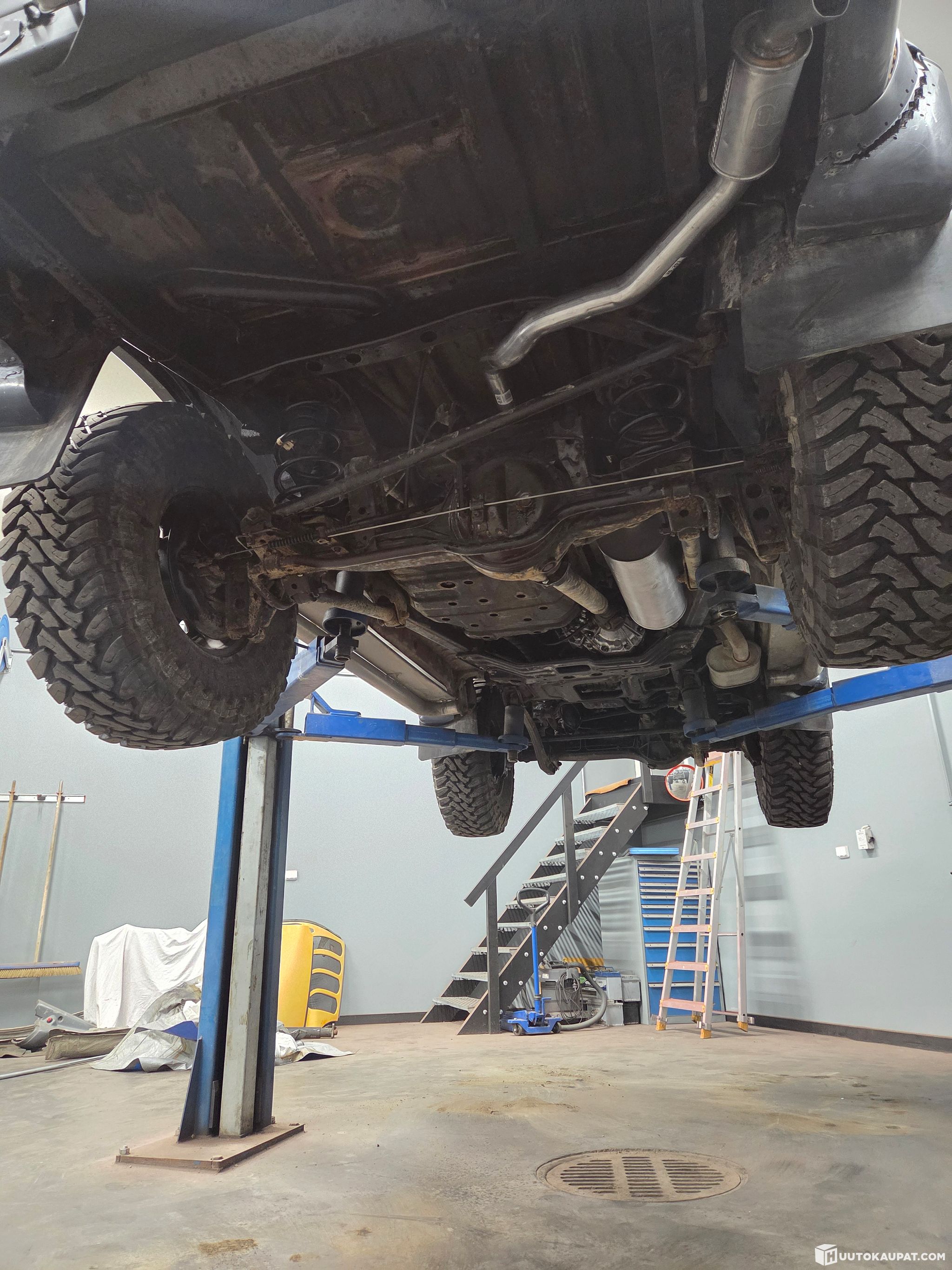 Etu sekä taka-akselin lukot testattu ja ne toimii. Moottorissa vedot tallessa ja vaihteisto myös vaihtaa oikein. Alla lähes ajamattomat Toyon isot nappularenkaat.