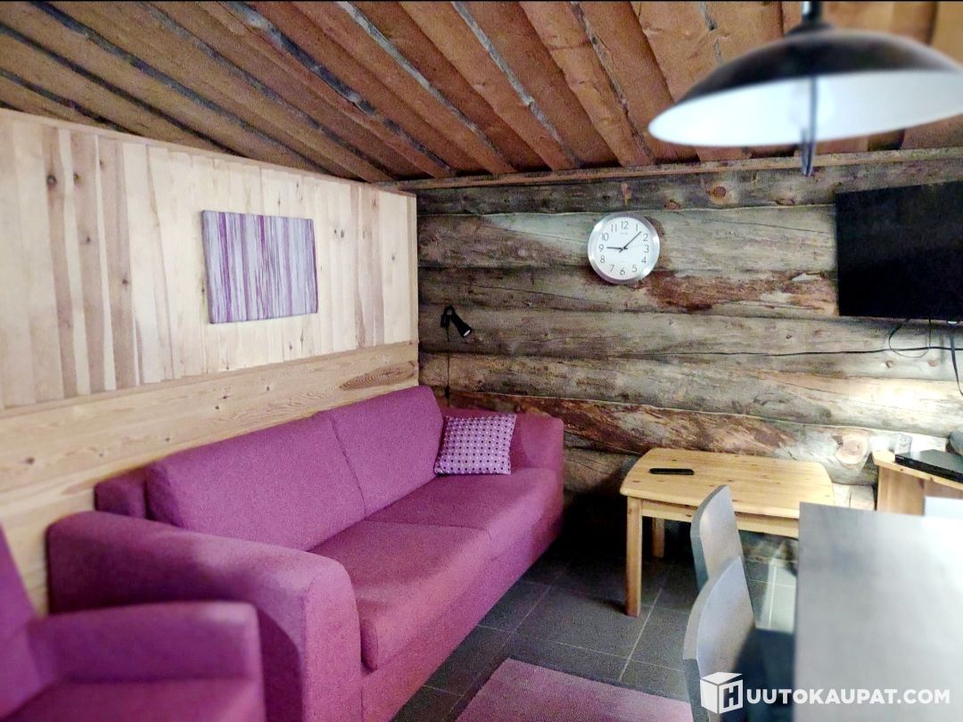 Kelohirsinen paritalomökki 37m2, jossa tupakeittiö, makuualkovi, sauna, kylpyhuone ja wc.