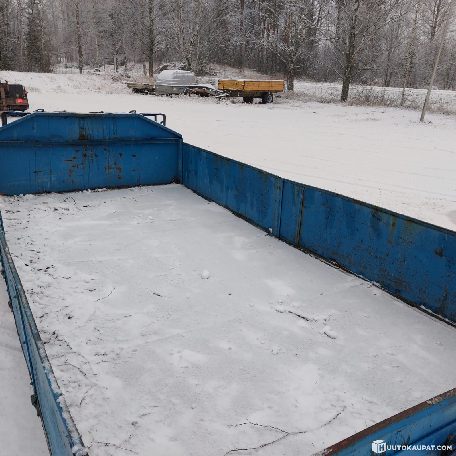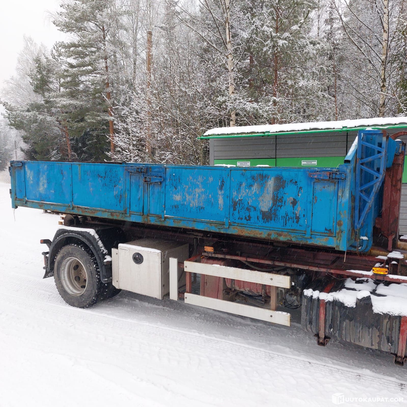 Käyttökuntoinen vaihtolava, aukeavat laidat, vaneripohja, sidontalenkit.