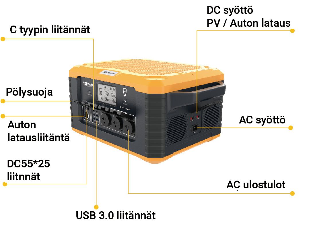 Varavirta-akku mökille, veneeseen tai kotiin sähkökatkojen varalta. Voidaan ladata joko FJ Dynamics agregaatilla, aurinkokennolla tai suoraan pistorasiasta. Varavirta-akulla voit ladata kännykkää, tietokoneita tai käyttää sitä kodinkoneiden virtalähteenä. Soveltuu myös esimerkiksi valokuvaajille, videokuvaajille tai dronen käyttäjille varavirtalähteeksi kuvauskeikoille. Monikäyttöinen, sekä kotitalouteen, että yrityksille.