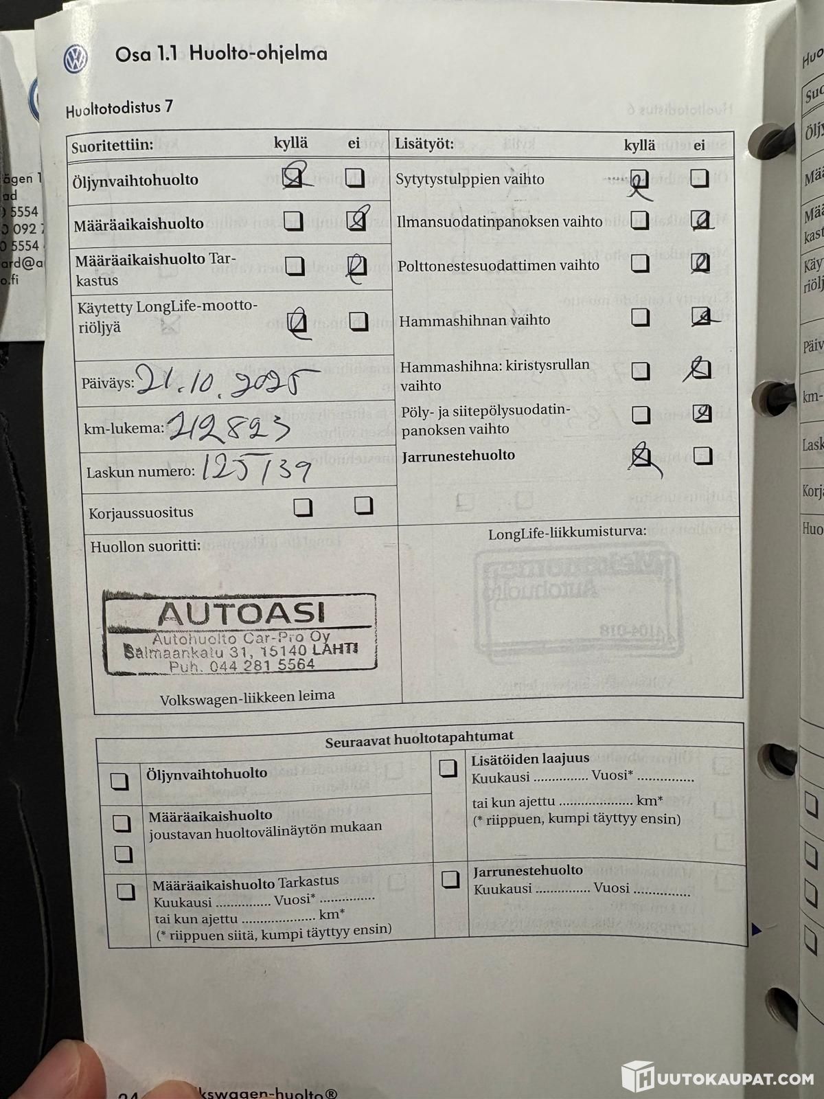 viimeisin huolto tehty 212tkm kohdalla