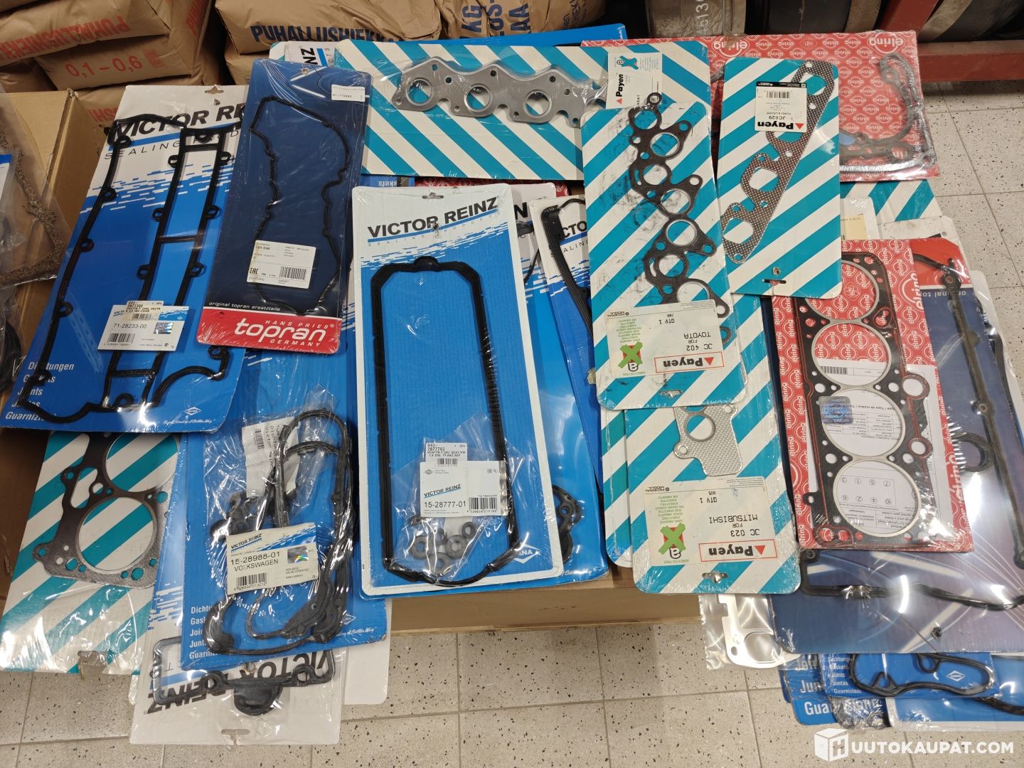 Kuvissa esimerkkejä tiivisteistä. Reilu 50 pakettia edelleen muoveissaan osasta muovi kuitenkin rispaantunut osittain rikki. Mukana myös muovikassillinen tiivisteitä ilman pakettejaan.