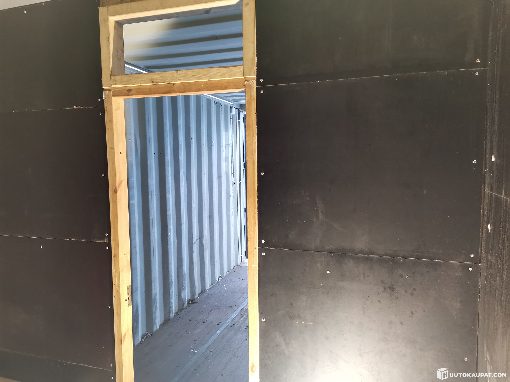 Etuosa n. 3.85m, takaosaan n.1.85 m rakennettu taukotupa. Seinät ja katto eristetty ja vuorattu vanerilla. Hieman sähkökaapeleita vedetty konttiin (mahdollisesti peräosaan saa valon)