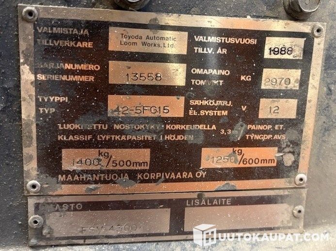 Huutokaupataan Toyotan 1,5 tn haarukkatrukki, Masto 3300 mm, 1,2 m haarukat