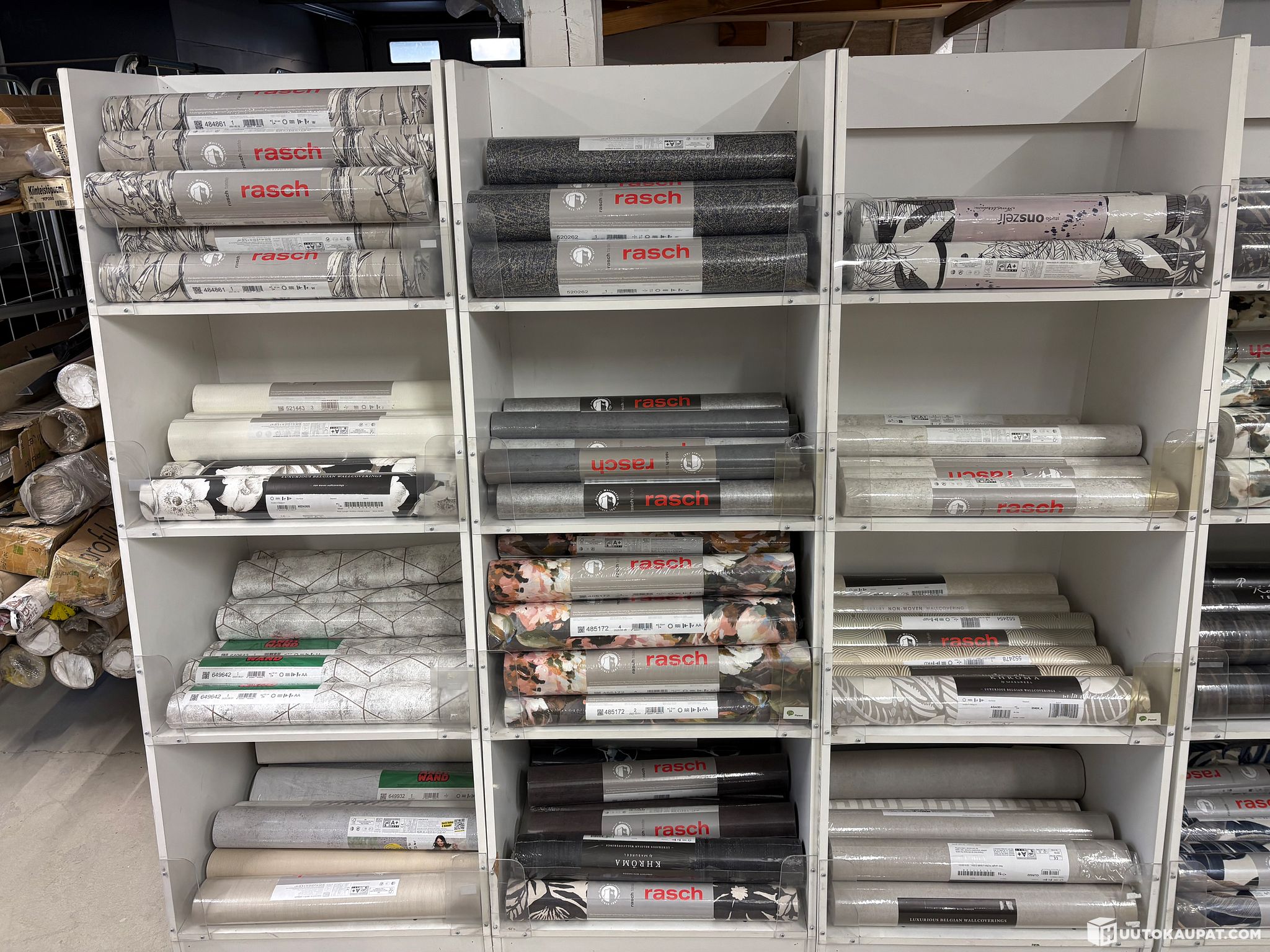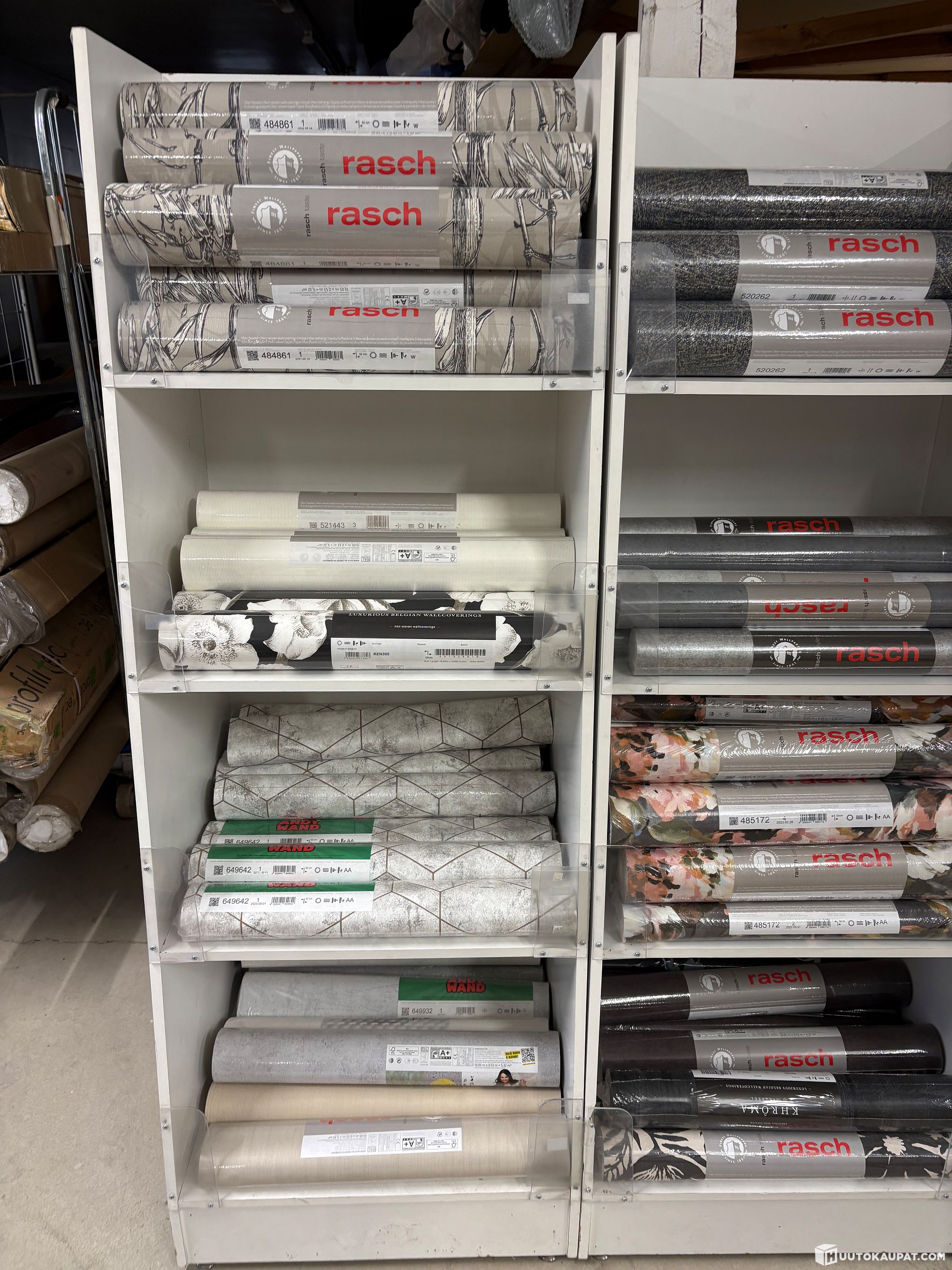 Löytyy myös täysiä lavoja ja myös vaalea sävyisiä tapetteja ja myös vähän lasikuitutapettia.