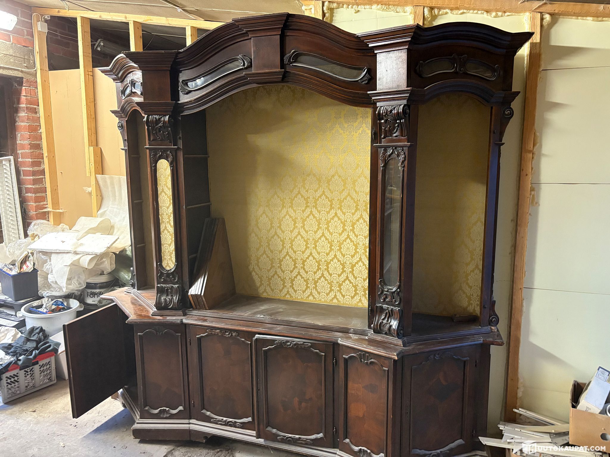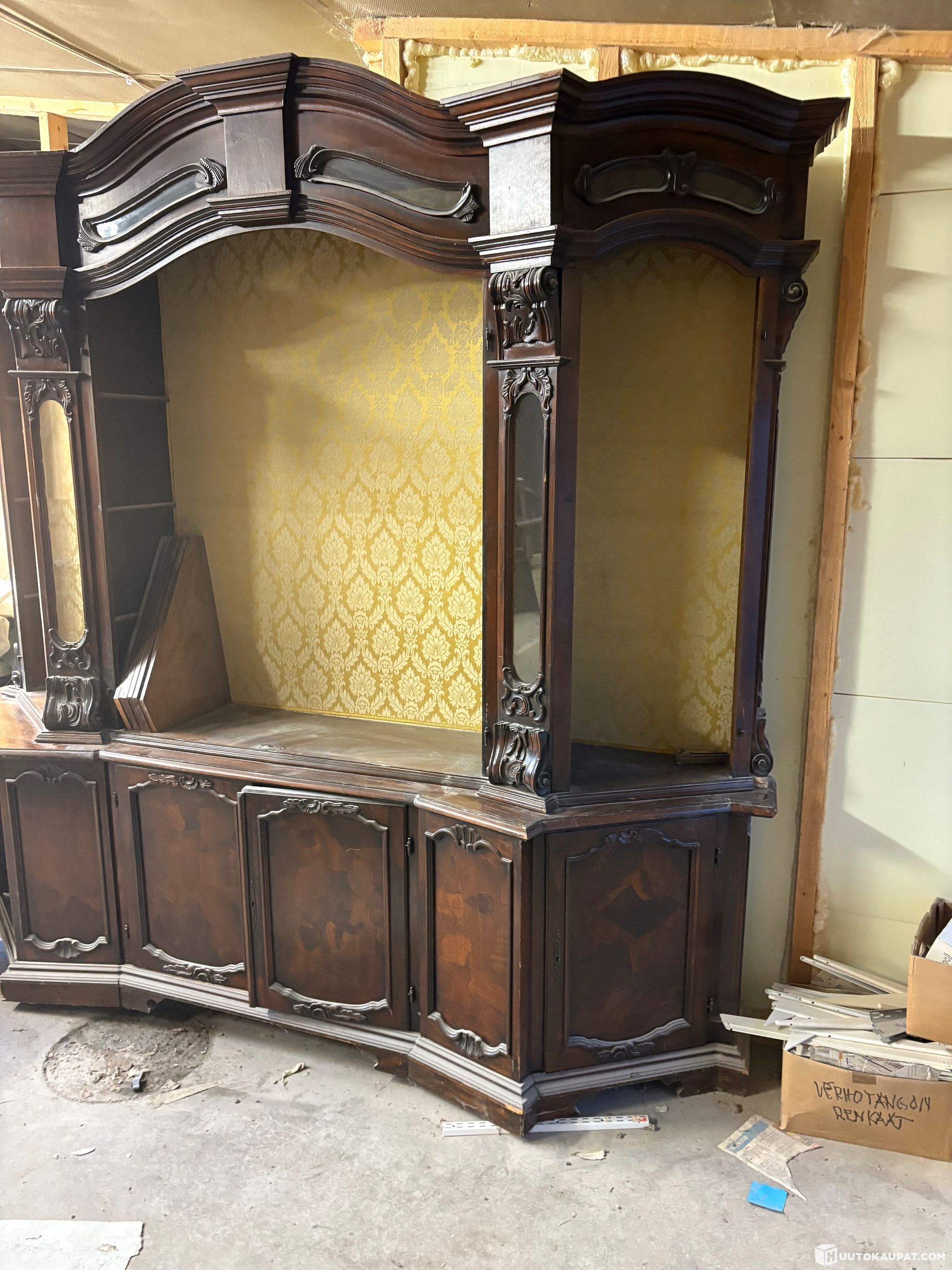 Paljon hienoja yksityiskohtia, keltaista kangasta sisäosa, neljä lasiovea ja lisäksi koristelaseja yläosassa. Ovet ja hyllyt on irrallaan ja kaappi kahdessa osassa, alakaappien päältä.