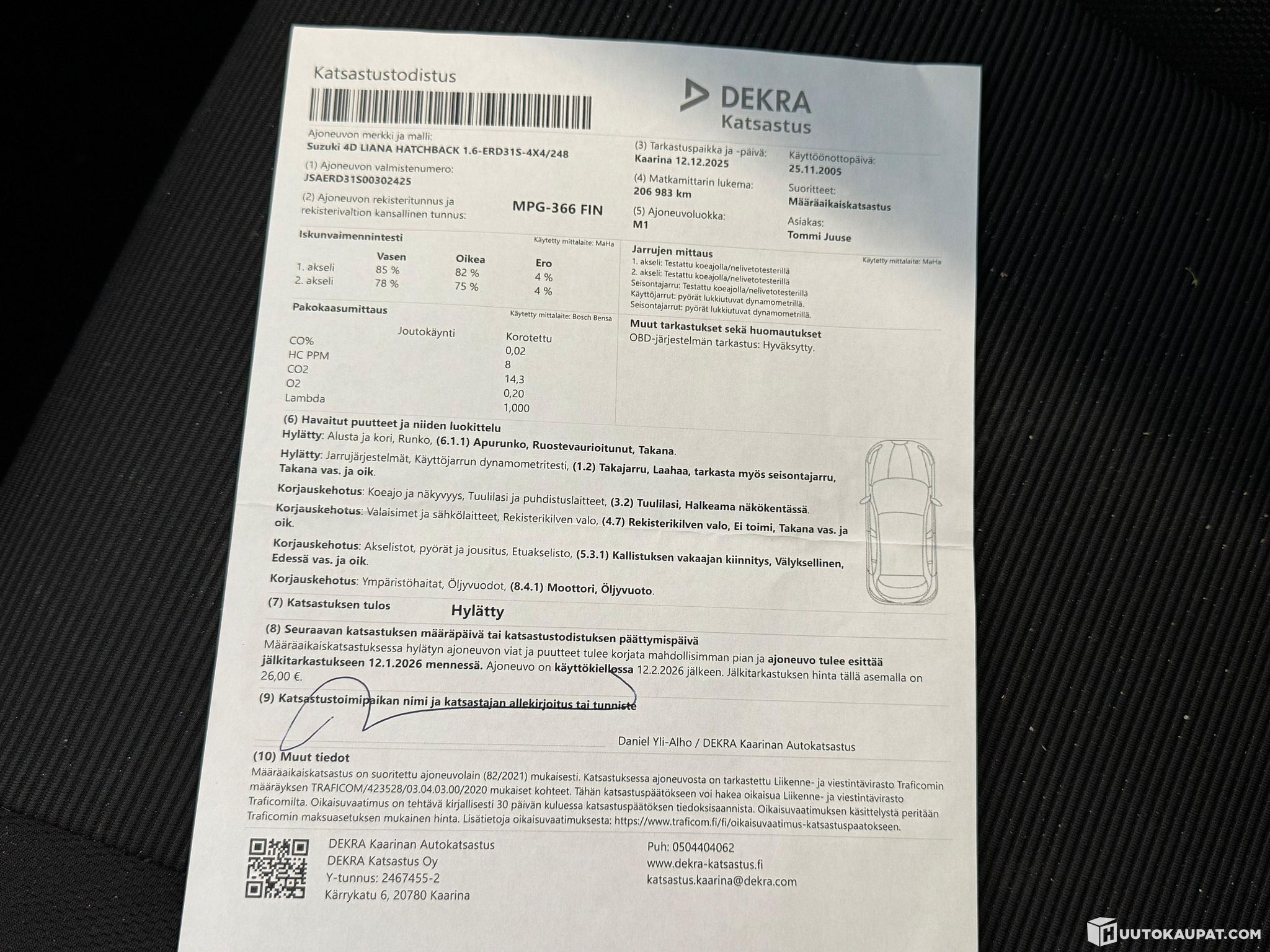 - Katsastuksessa tullut hylky. Vikalistasta kuva